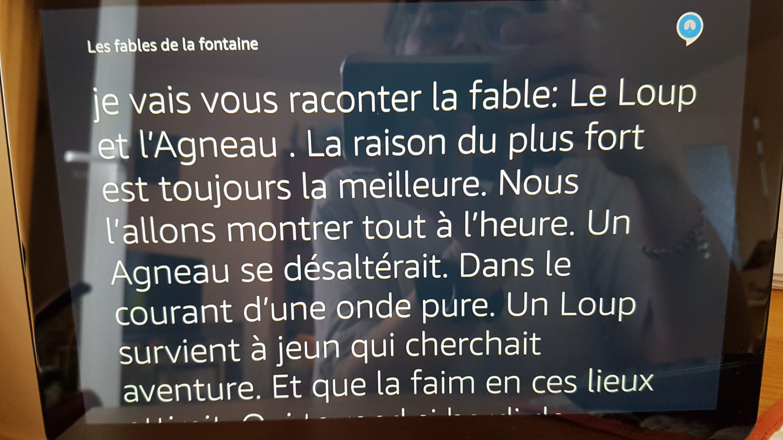 La skill s’ouvre à la commande : « Alexa ouvre Fables de la Fontaine ». Si vous avez un écran à disposition (Spot ou Show) le texte de la fable s’affiche. Mais autant sur l’un que l’autre seul le début de la fable s’affiche et si vous touchez l’écran pour faire défiler le texte, la skill s’arrête. Il faut la rouvrir et là pas sûr d’avoir la même de proposée en narration. C’est assez dommage de ce point de vu. Le ton monocorde d’Alexa utilisé pour réciter la Fable est compréhensible, n’oublions pas que c’est une IA qui parle…