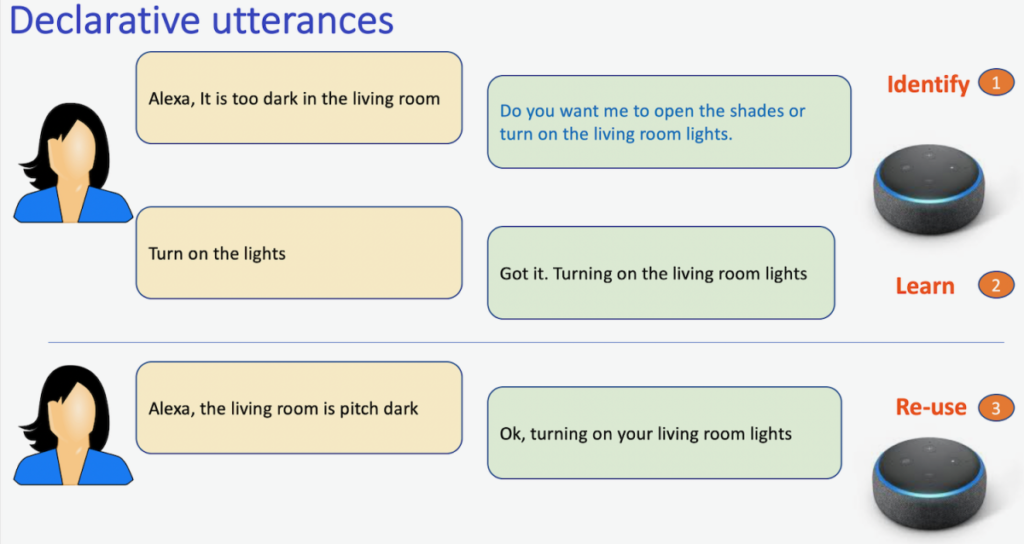 En effet, contrairement aux routines Alexa, où les clients utilisent l’application pour associer des actions à des déclencheurs verbaux (comme éteindre les lumières lorsque le client dit « bonne nuit »), l’apprentissage interactif permet à Alexa d’engager une conversation pour poser des questions sur des concepts inconnus ou non résolus, et ainsi accomplir des tâches qui échoueraient en temps normal.
