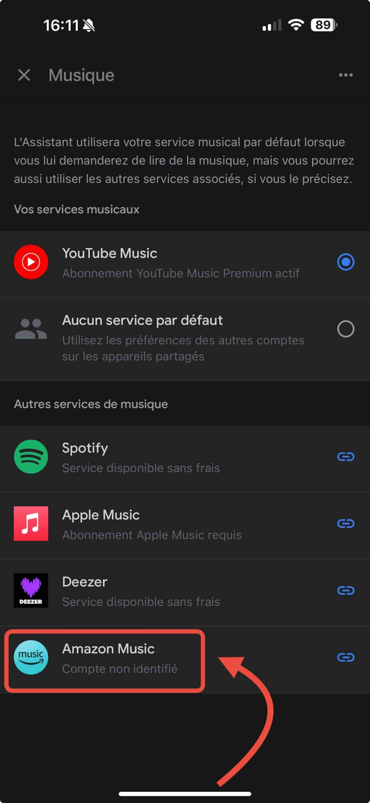 - Sélectionnez « Musique » et choisissez Amazon Music dans la liste.