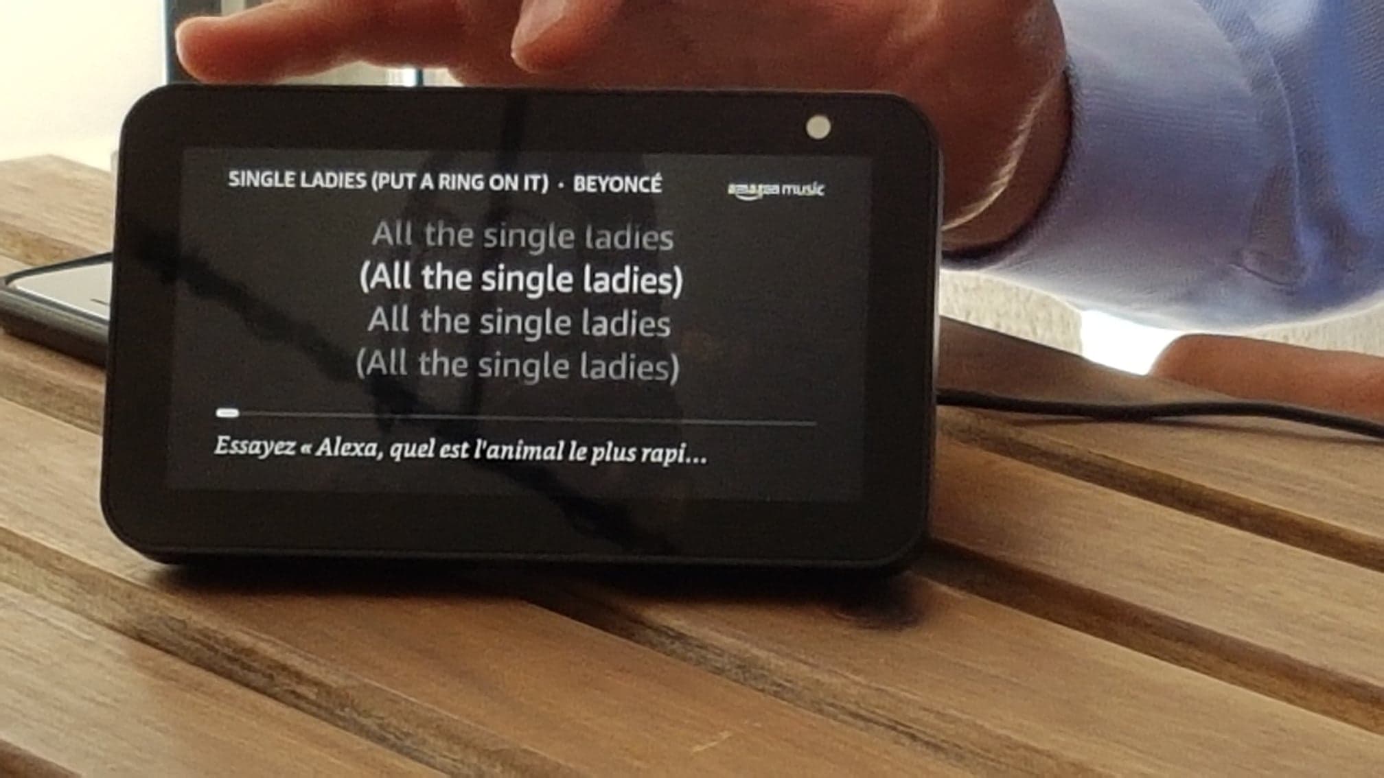 - Niveau son, Echo Show 5 est équipé d’un caisson de basse et pour sa taille, le rendu est énorme, pour ne pas dire bluffant. Les paroles de vos chansons favorites pourront, comme sur Echo Show 2 et Echo Spot, être visualisées pour les musiques streamées via Amazon Music. De plus en plus de chansons sont d’ailleurs compatibles. La fonctionnalité est aussi en cours de déploiement sur d’autres services…