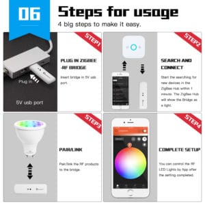 C’est en fait un « traducteur » qui va venir convertir un signal de contrôle ZigBee en signal Radio Fréquence. Celui-ci sera reconnu par les lumières LED RF 2.4G et permettra de les contrôler via le hub ZigBee à votre disposition. Votre propre hub reconnaitra le pont USB comme une « lumière » individuelle qui va remonter sur l’application et sera ainsi contrôlable via l’application… ou même par la voix si cette dernière est reconnue par Alexa.
