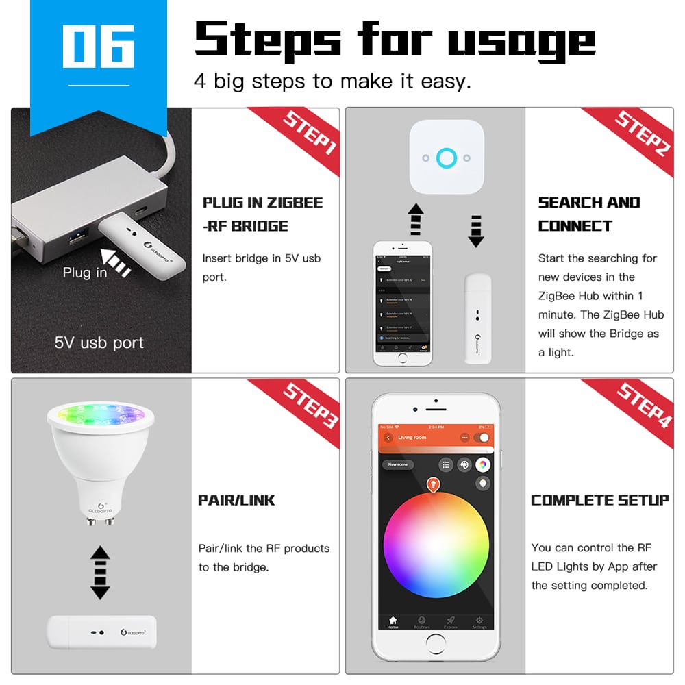 Le pont GLEDOPTO USB ZigBee RF de GLEDOPTO va vous permettre de contrôler vos luminaires fonctionnant en Radio Fréquence 2.4 Ghz comme des spots, des ampoules, des bandes LED… grâce à un Hub ZigBee comme le Philips HUE, Lightify, Amazon Echo Studio, Show 2 ou Plus ainsi que d’autres passerelles ZigBee. Attention, il n’est pas encore compatible avec le pont Ikea Trådfi.