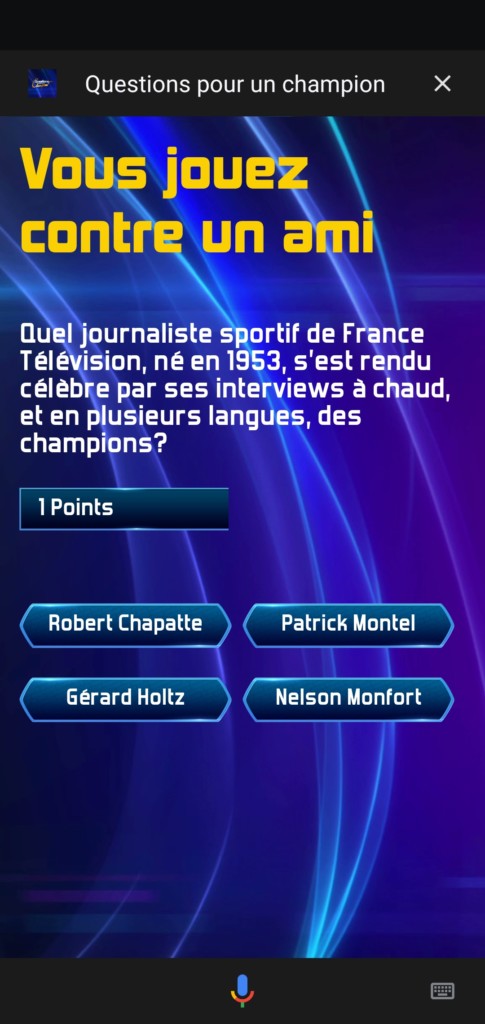 Aujourd’hui ce n’est pas d’une skill de jeu Alexa que nous allons vous proposer, mais un jeu pour Google Assistant qui devrait en intéresser plus d’un : Questions pour un champion. Le célèbre jeu télévisuel vient en effet de débarquer gratuitement sur Android ainsi que sur les appareils Google Home, nous permettant de jouer seul ou à plusieurs, histoire de tuer un peu le temps pendant ce confinement !
