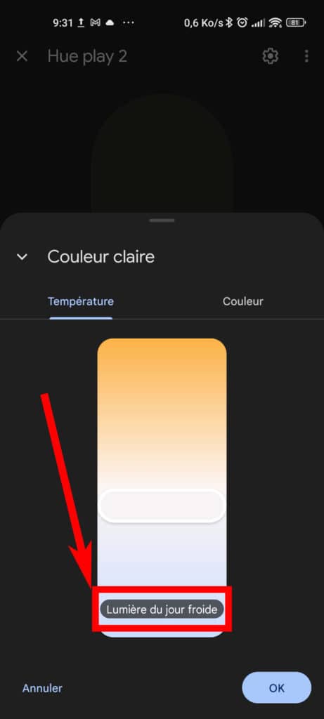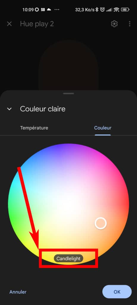 Les plus observateurs remarqueront aussi l’affichage rapide du nom de la couleur sélectionnée. Un ajout pas si anodin que ça puisqu’il permet de plus facilement sélectionner la même couleur sur plusieurs éclairages ou, pourquoi pas, de l’appeler vocalement en la demandant à Google Assistant.