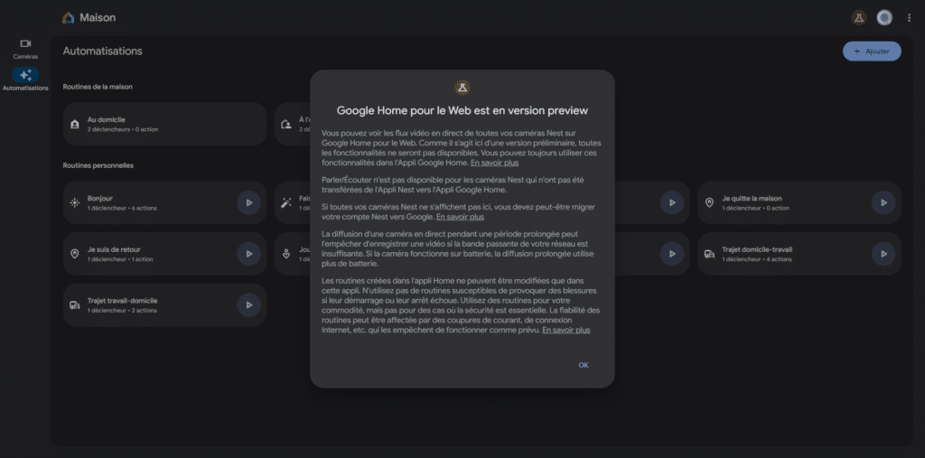 Reste que l’exécution dans le cloud de sa domotique expose une maison connectée à des pannes, un souci récurrent sur cette plateforme qui n’a jamais brillé pour sa stabilité. Entre disparitions inexpliquées de routines et volatilisations incompréhensibles de fonctionnalités pourtant appréciées des utilisateurs, il faudra un peu plus de constance pour fiabiliser le système. La documentation de l’éditeur de scripts de Google Home précise d’ailleurs que « la fiabilité des routines peut être affectée par des coupures de courant, de connexion Internet, etc. qui les empêchent de fonctionner comme prévu ». C’est un vrai problème pour les utilisateurs avancés, mais le déploiement de Matter pourrait offrir un début de réponse à cette problématique.