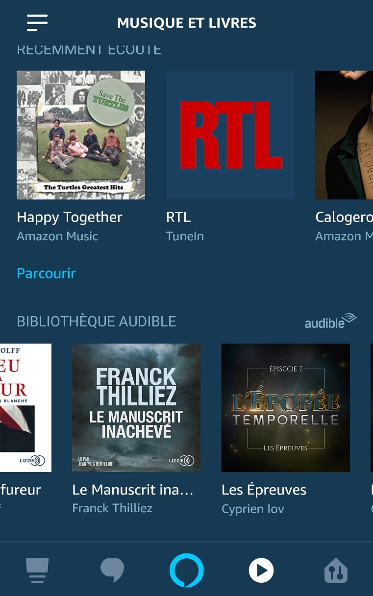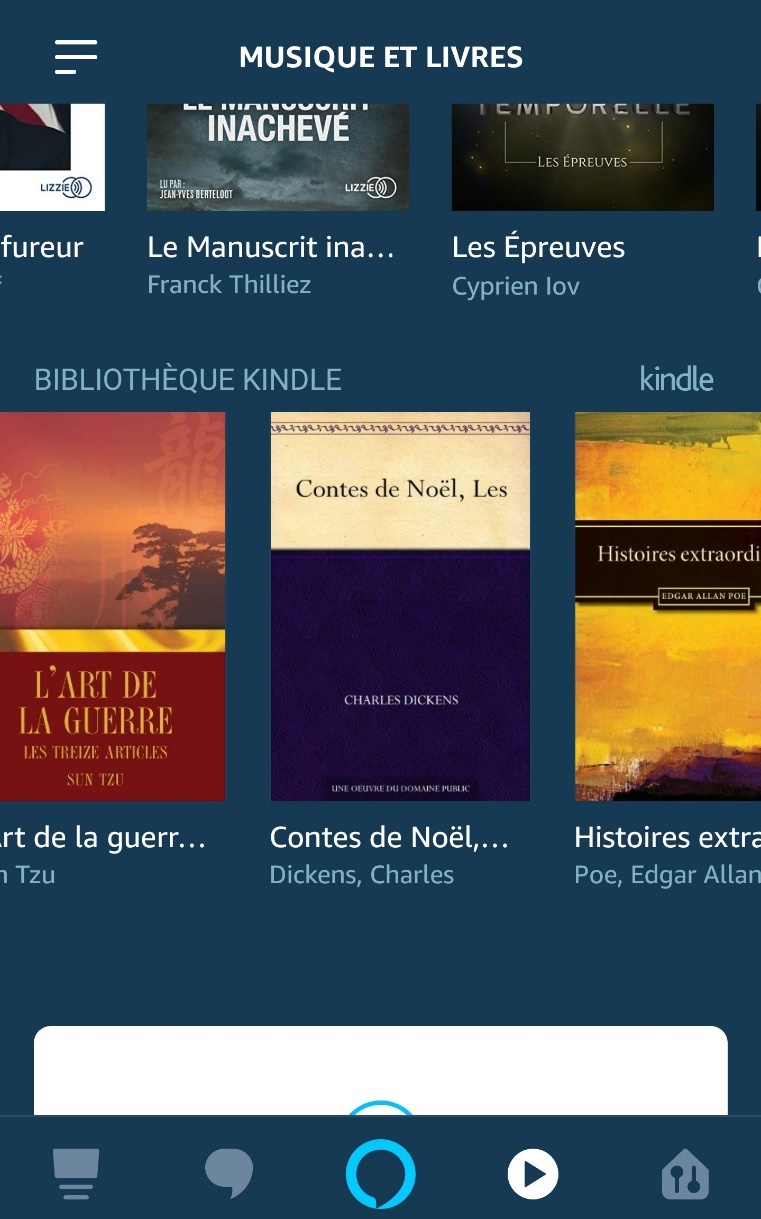 Vous avez ensuite accès à la partie livres. Et là, c’est beaucoup plus ergonomique qu’avant. Si vous êtes abonné à Audible, vous avez accès à votre bibliothèque. Si vous avez un Kindle, vous avez accès à vos livre compatibles, c’est-à-dire avec DRM, achetés sur Amazon (on se comprend ?). Si vous écoutez via Audible, vous avez exactement le même livre que sur votre smartphone, normal, mais en écoutant vos livre Kindle, c’est Alexa qui vous les lira…