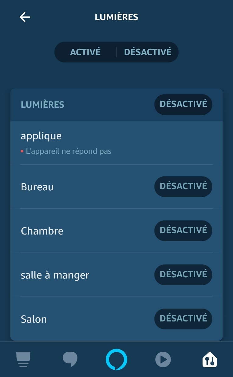 Tout d’abord, tous vos appareils connectés sont listés par catégories, en haut : les appareils Alexa, vos lumières, prises, interrupteurs, thermostats… Vous pouvez, en sélectionnant votre appareil dans la liste, directement le mettre en ligne ou hors ligne. C’est bien plus simple qu’avant.