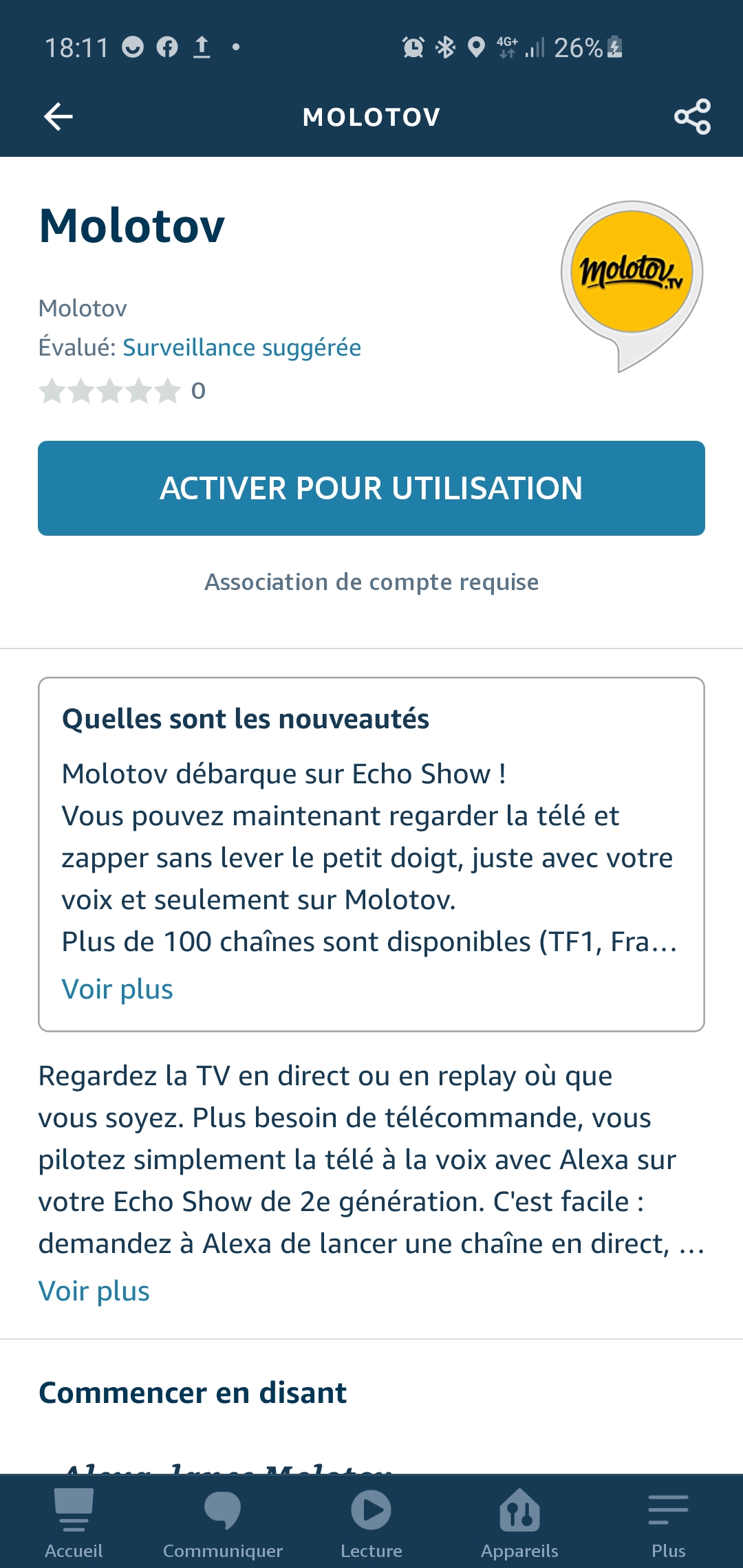 Ça y est, un des services les plus attendus chez Alexa est enfin disponible : Molotov sur Echo Show ! Nous vous avions en effet révélé en avant-première son arrivée prochaine à la suite de la découverte par une membre de notre groupe Facebook d’une bannière sur l’application Molotov. Malheureusement, elle fut très rapidement retirée et nous n’avions plus aucune information à ce sujet depuis. Aujourd’hui disponible, le service est totalement gratuit !