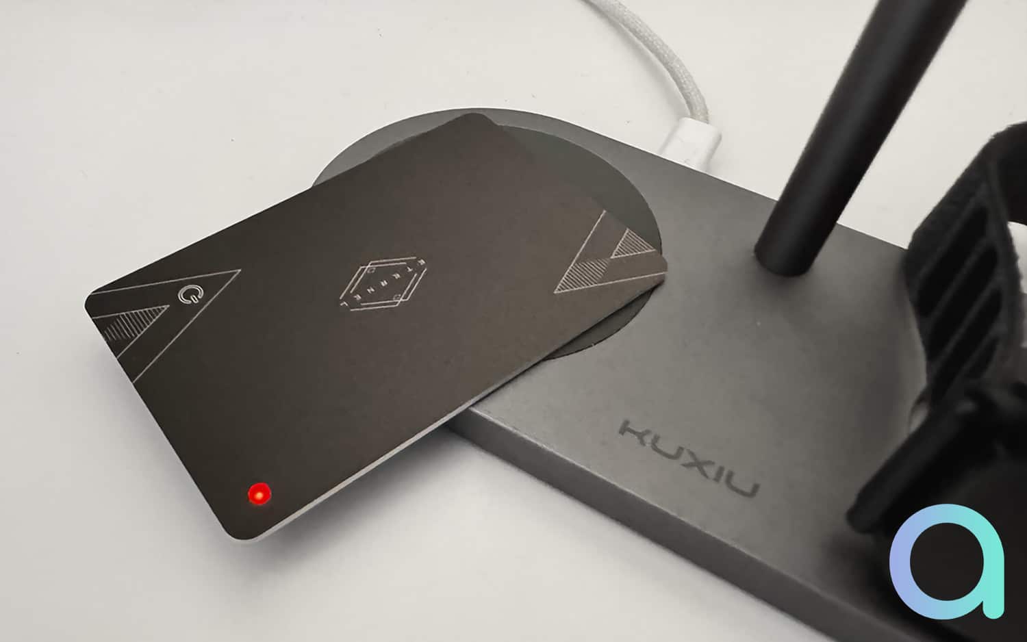 Finesse oblige, pas de port USB-C, la carte de tracking Éternel se recharge par induction. Elle est compatible avec tous les chargeurs sans fil Qi, vous pouvez donc utiliser celui de votre iPhone ou de votre Apple Watch, ou comme nous une station qui permet de recharger plusieurs appareils – ndlr, puisque vous nous l’avez demandé, la photo ci-dessous montre une KUXIU X23 Pro qui coûte environ 60€ sur Amazon. Une petite LED vous indique si elle est en cours de recharge (rouge) ou pleinement chargée (bleue).