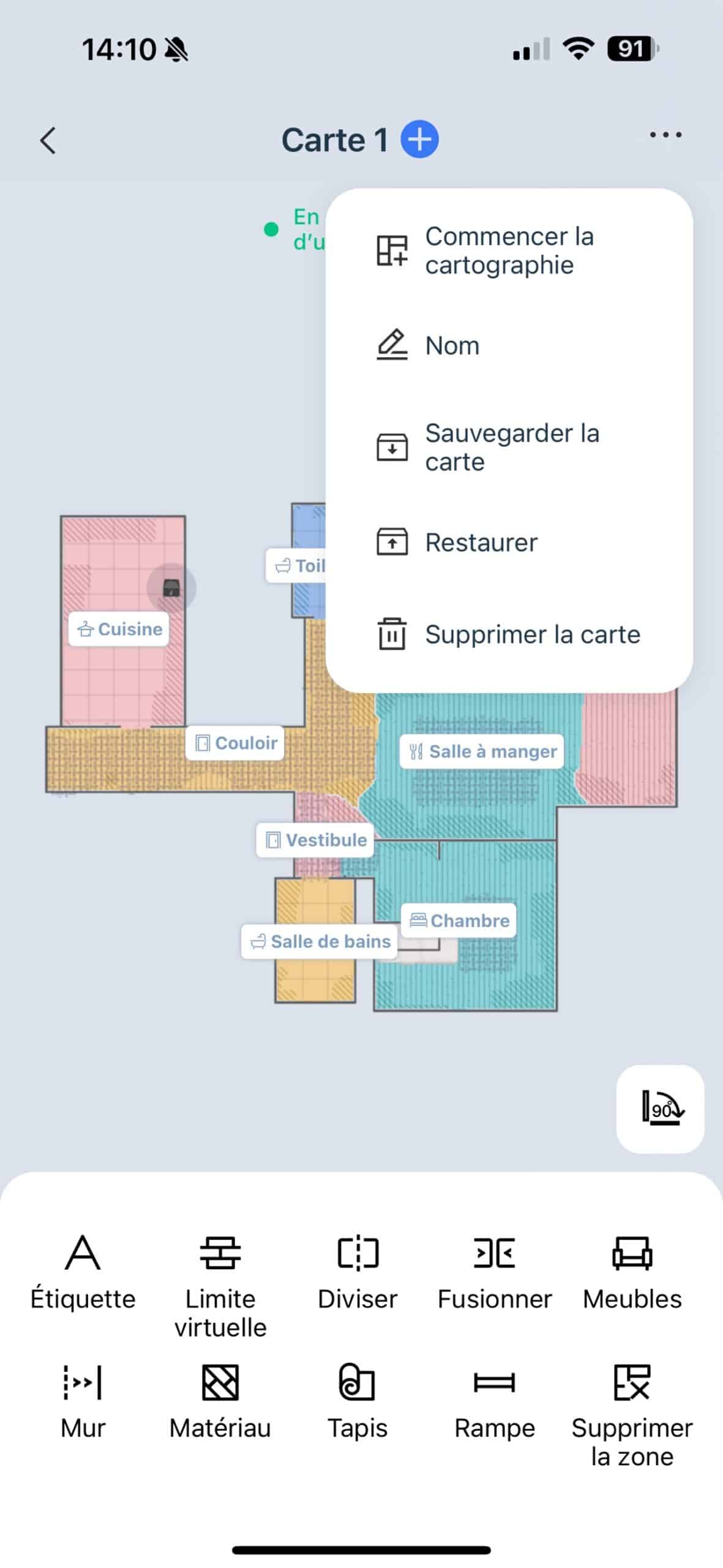 Grâce à ses capteurs laser, ses caméras et son intelligence artificielle embarquée, le Deebot X8 Pro Omni effectue un première cartographie sans faire de nettoyage. La procédure est rapide, le robot cavalant de pièce en pièce avant de retourner sans difficultés à sa station. Nous avons d’ailleurs été surpris par sa vitesse d’exécution, mais également par la précision de la carte qui est entièrement personnalisable. Vous pouvez renommer et redécouper les pièces si nécessaire, indiquer le type de sol et placer des meubles, définir des zones interdites et programmer des séquences nettoyage, voire même créer plusieurs cartes pour vos étages ou dépendances…
