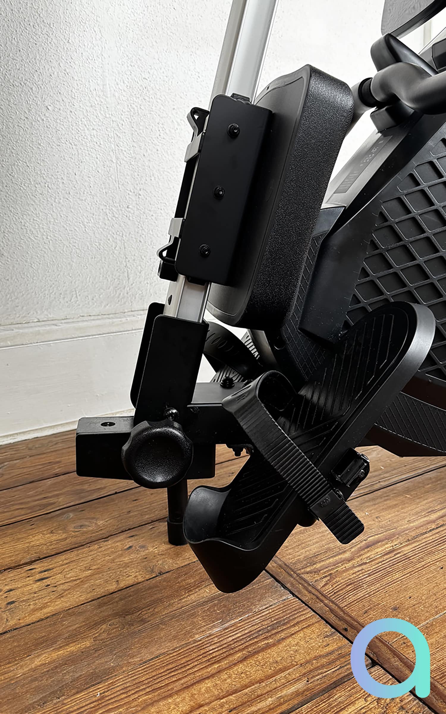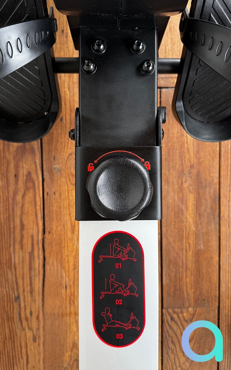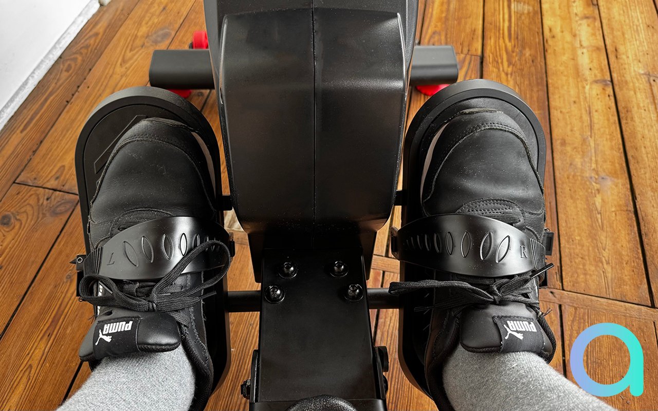 Le cale-pieds est fixe, ce qui est une bonne chose, mais son système d’attache est perfectible. En effet, il m’arrive régulièrement d’avoir le talon qui se décolle ou qui sort complètement, ce qui n’est pas très agréable en plein effort. Il faut donc prendre soin de bien positionner et serrer les sangles avant chaque séance pour éviter que cela se produise. Malheureusement, il n’y a que deux positions d’attache, qui visiblement ne correspondent pas trop à ma pointure 43, pourtant on ne peut plus répandue. J’ai également eu la surprise de perdre des boulons en cours d’exercice, un serrage régulier semble donc nécessaire. Enfin, la barre de tirage offre une bonne préhension et sa console centrale est facile à manipuler même en ramant.