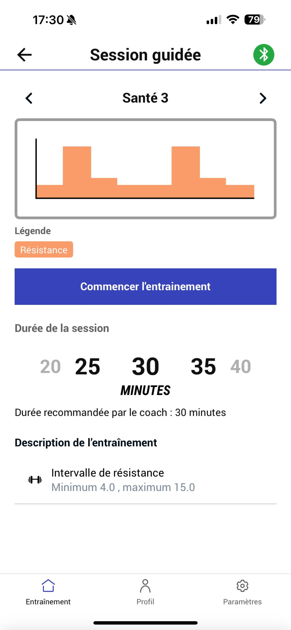 Decathlon nous propose également des sessions guidées par catégorie : santé, brûler des calories, endurance et fractionné. Vous choisissez la durée de la session, vous appuyez sur « commencer l’entraînement » et le rameur va automatiquement modifier la résistance pendant la session. Pas mal, mais je préfère personnellement les entraînements à cadence variable…
