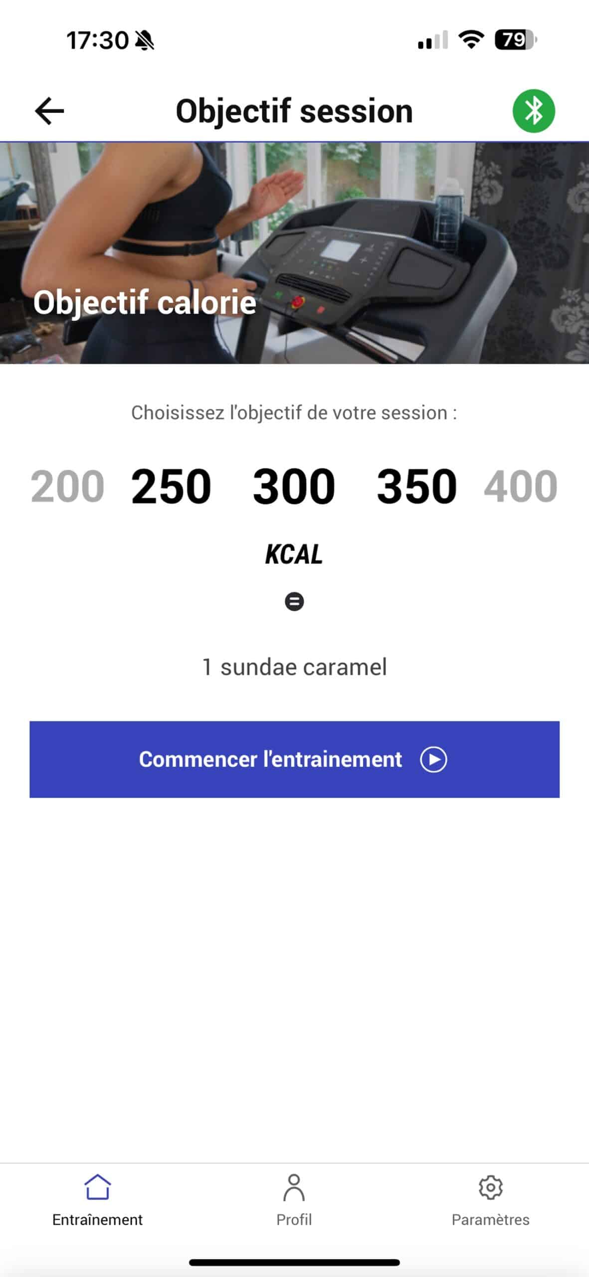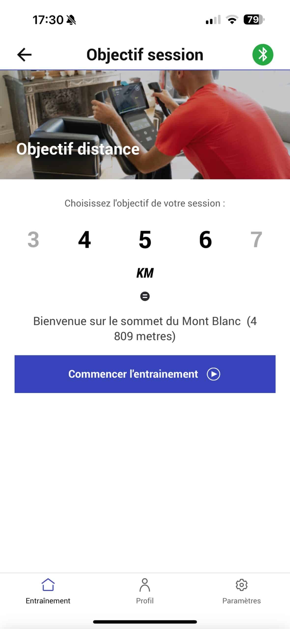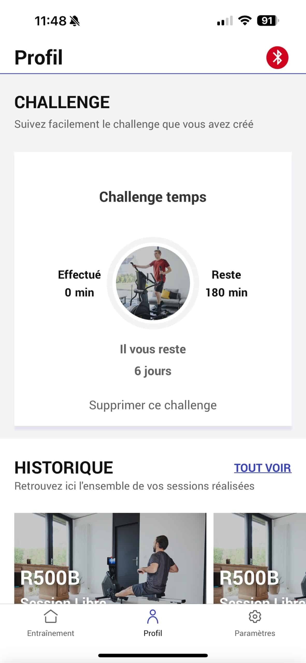 Une fois le rameur appairé en Bluetooth, il est possible de démarrer immédiatement une session libre ou de définir un objectif d’entraînement : durée de la session, distance à parcourir ou calories à dépenser. Simple, plutôt efficace, mais pas très pratique car seulement accessible lorsque le rameur est connecté. Autrement dit, quand vous l’utilisez. Il vous font donc ramer d’une main et manipuler votre smartphone de l’autre… On a vu plus pratique.