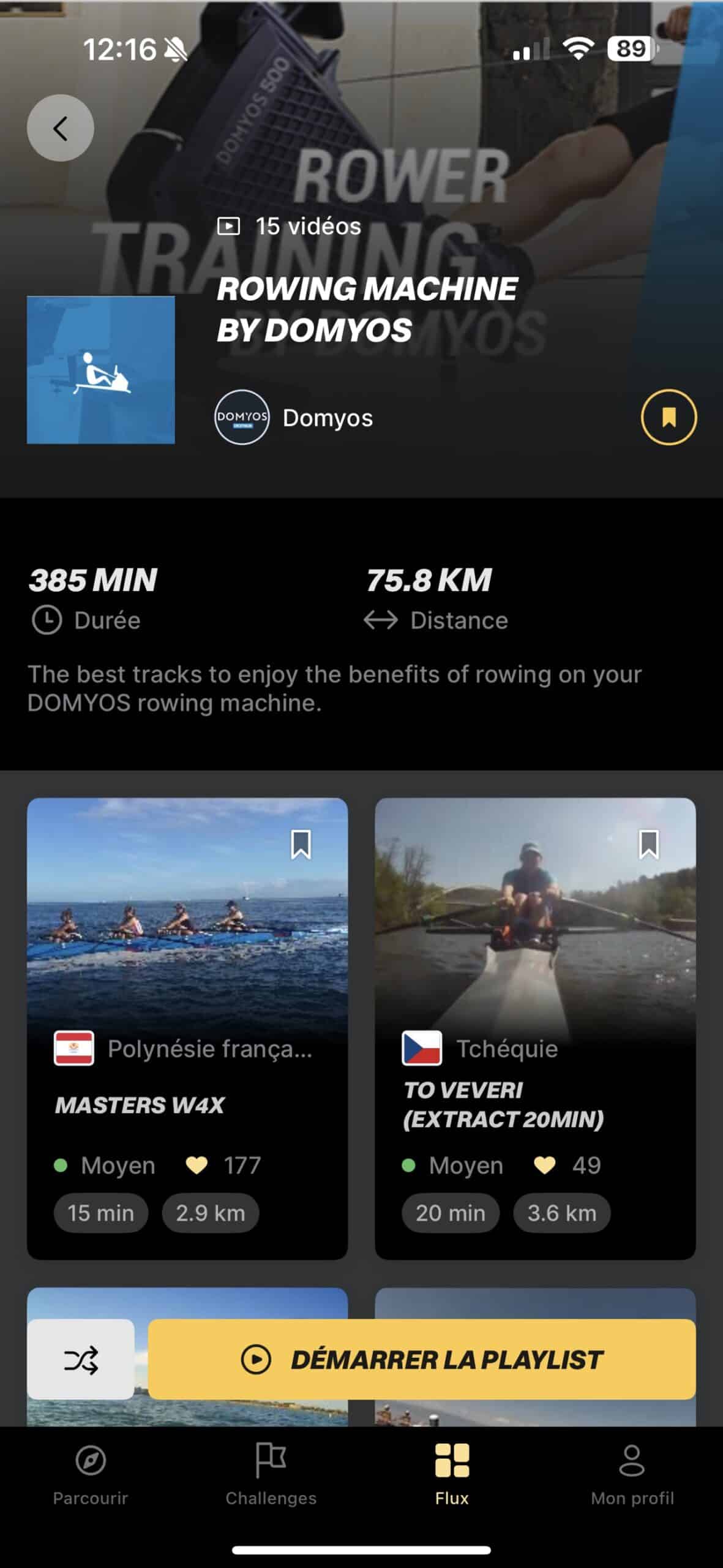 Vous pouvez profiter d’entraînements libres et structurés, comme de séances de coaching gratuites, avec notamment une playlist de la Fédération Française d’Aviron, mais aussi une spécialement créée pour les utilisateurs Domyos. Avec 385 minutes de vidéo incluses avec le rameur, vous avez gratuitement à disposition 76 km à parcourir sur les eaux du monde entier. Il y a vraiment de quoi faire !