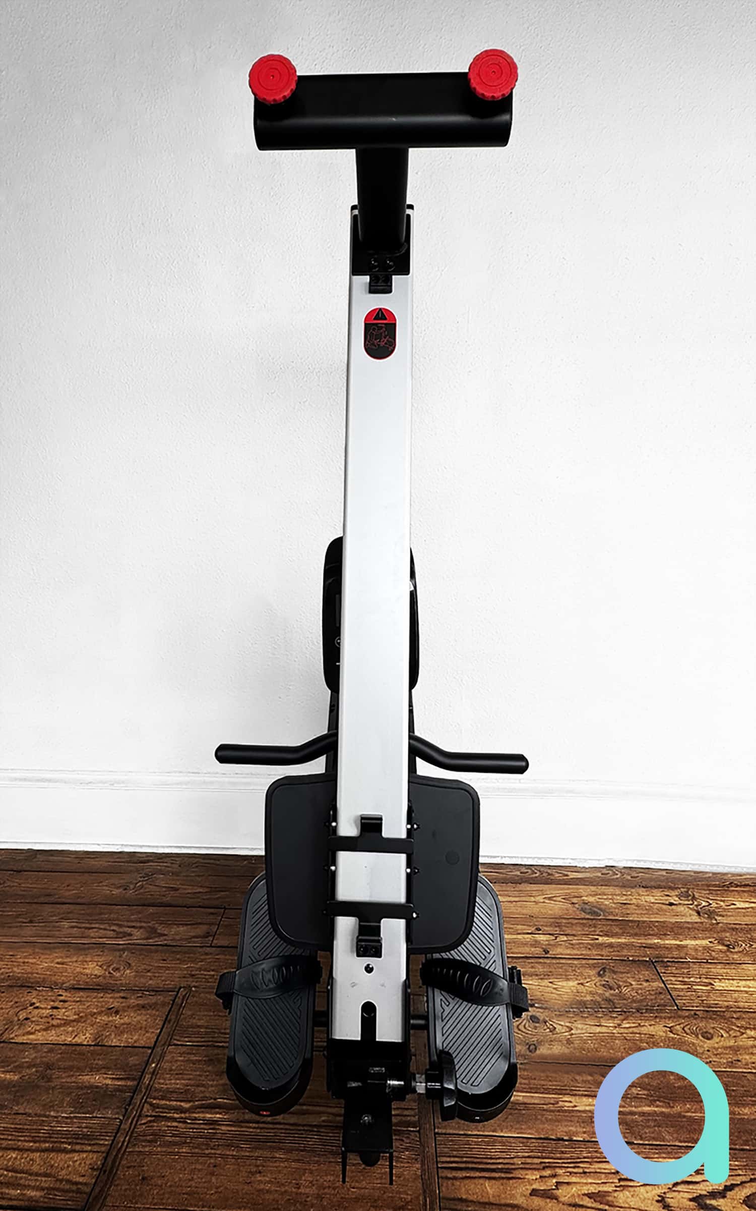 Parmi les qualités, son design compact et pliable s’avère particulièrement adapté à un usage domestique : il se range sans difficulté après chaque séance dans le coin d’une pièce. Son système auto-alimenté est également une idée judicieuse car il permet de l’utiliser partout sans se soucier des prises électriques. Si, comme moi, vous n’avez pas (encore) de salle dédiée au sport, vous pouvez ainsi pratiquer dans votre grenier, garage ou véranda… Et même à l’extérieur si le temps le permet. Malgré tout, ce système dynamoélectrique a ses limites et l’écran ne reste allumé que très peu de temps dès que vous cessez de ramer. Trop peu de temps même, environ une minute, ce qui oblige à faire certaines manipulations sur son smartphone d’une main, tout en ramant de l’autre. Pas très pratique. Une petite batterie offrant quelques minutes d’autonomie n’aurait pas été de refus !