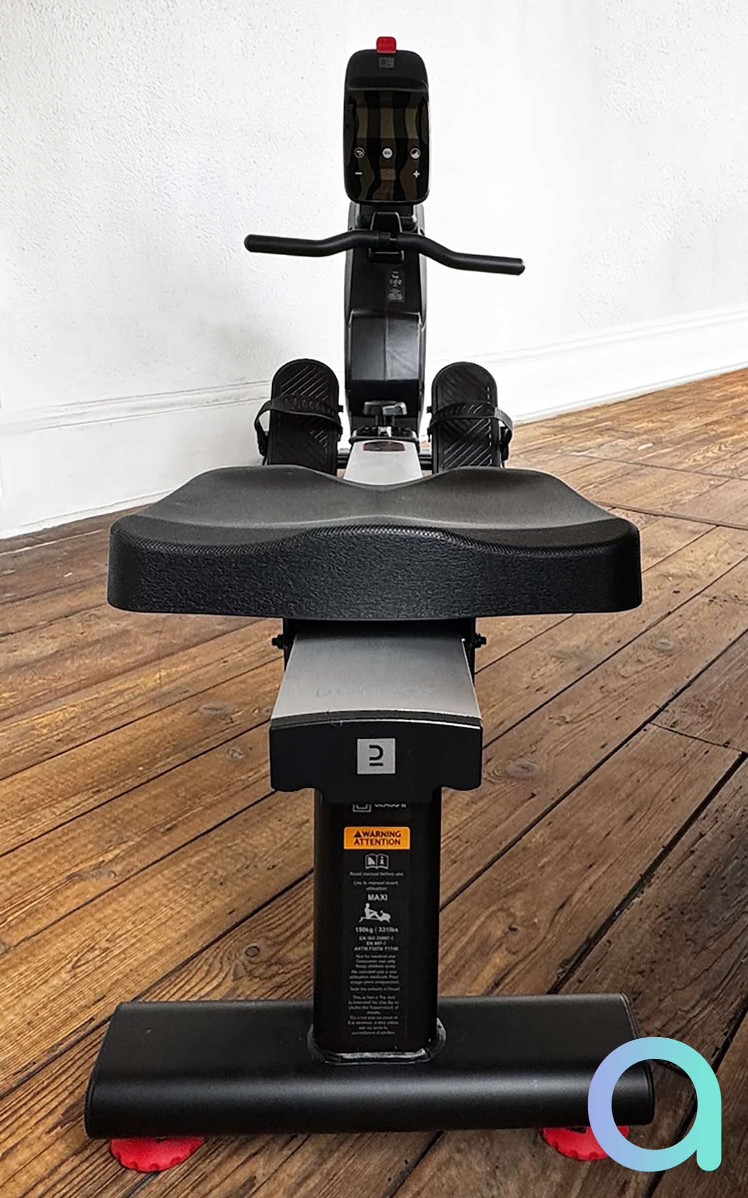 En effet, le Domyos 500B est équipé de roulettes et d’un système assez ingénieux permettant de relever la coulisse, qui rappelons-le est en aluminium et donc très légère, puis de s’en servir pour le pousser. Une fois replié et sécurisé, ce rameur occupe moins d’un mètre carré, ce qui est particulièrement intéressant si vous n’avez pas de pièce dédiée au sport.