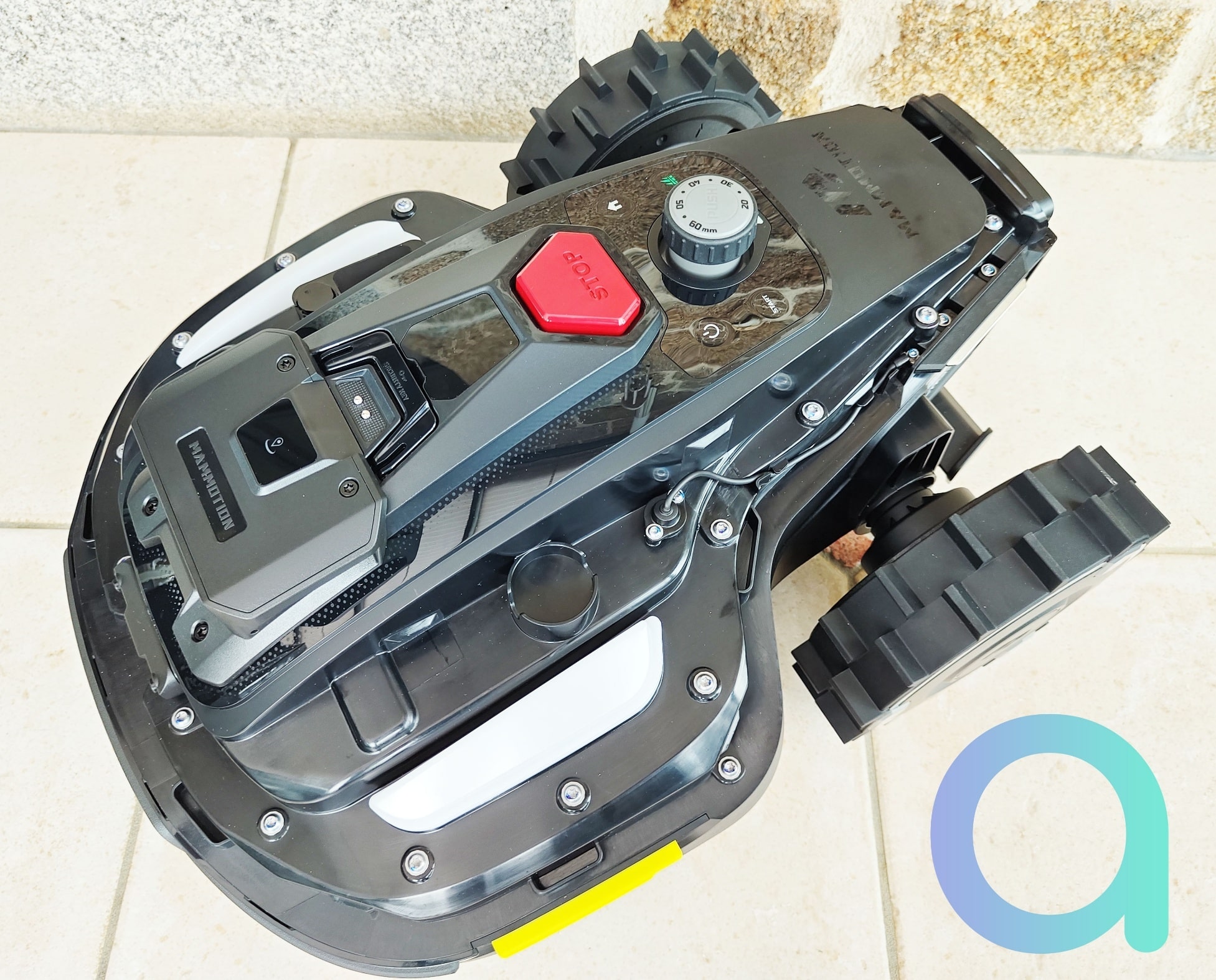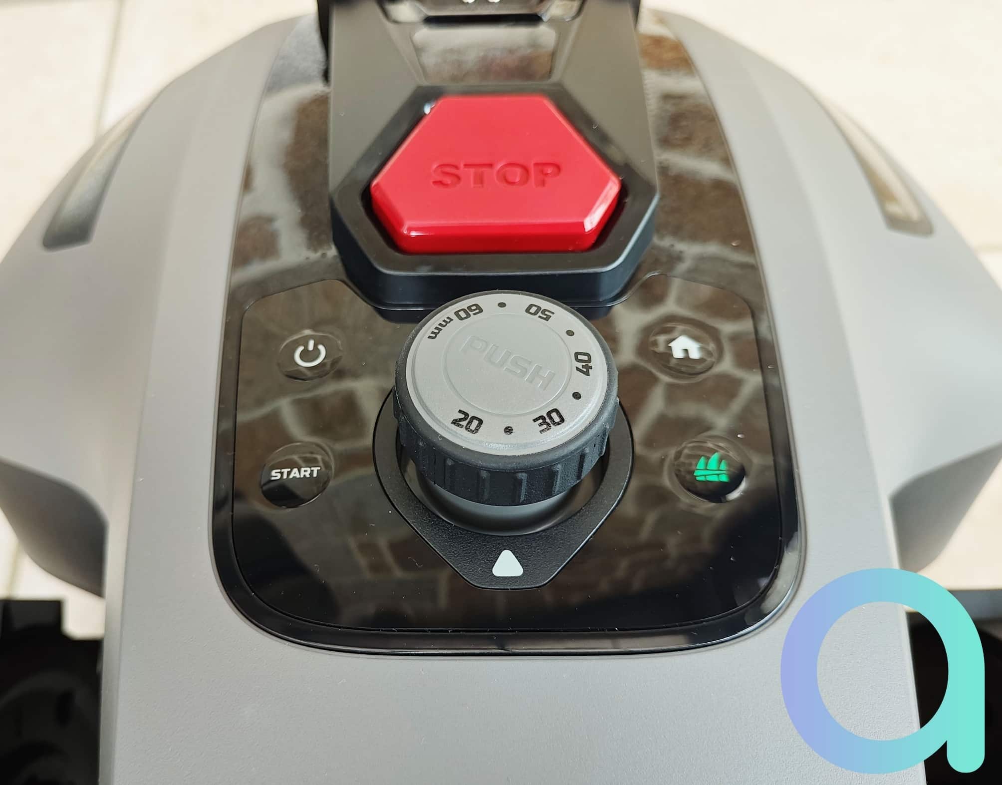 En remontant un peu, nous trouvons le panneau de contrôle. La première chose visible, en plus du trapèze rouge « Stop » (arrêt d’urgence,) est le bouton de sélection de la hauteur de coupe. Hé oui… Entrée-de-gamme oblige, le réglage de la coupe se fait à la main. Dommage… Appuyez dessus et tournez pour choisir une tonte de 20 à60 mm, par tranche de 5 mm. Nous trouvons autour :