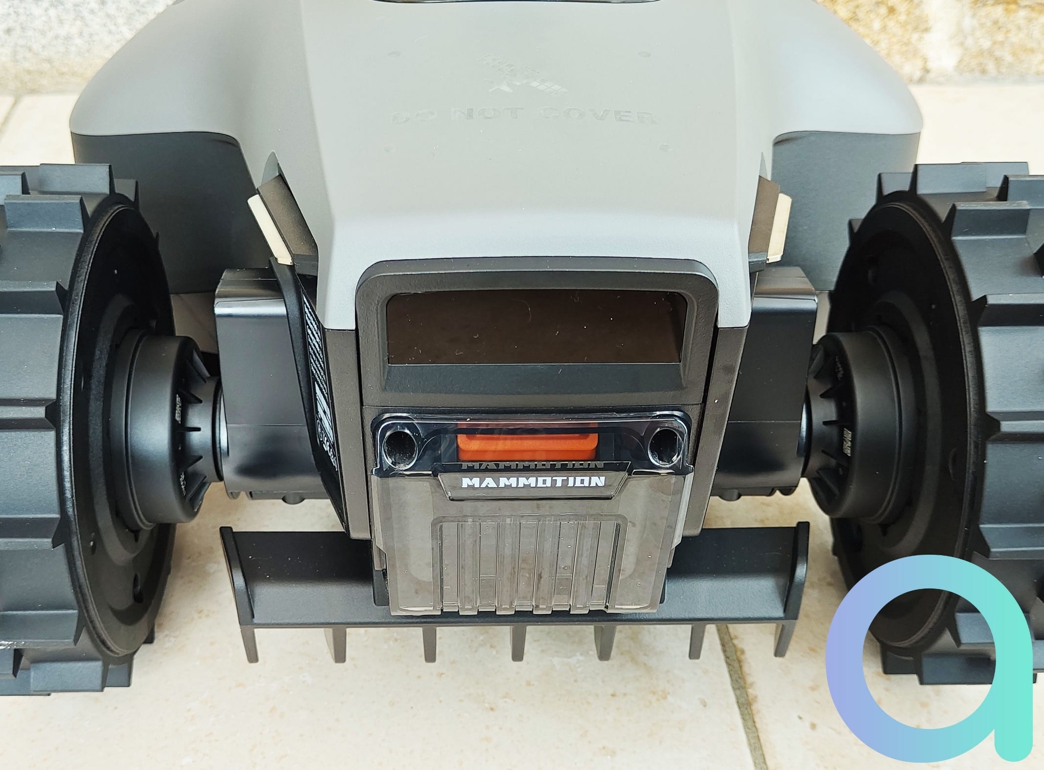 Sur l’arrière des Yuka Mini Series, il y a un capteur infrarouge qui sert au retour au dock de chargement, à la manière des robots aspirateurs. En dessous se trouve la batterie, que vous pouvez enlever en ôtant deux vis. Donc très bien pour la remplacer en cas de problème. Celle du Yuka Mini 800 est une Li-Ion de 6,1 Ah et 21,6V. Pour la version 700, nous sommes du 4,5 Ah et du 2,4 Ah / 21,5 V pour les 600 et 500. De ce fait, l’autonomie est fonction de ces différences avec 150, 110 et 55 minutes. Le temps de charge également qui sera respectivement de 230, 180 et 90 min. La version 800 m² va donc tondre 2h30 et devra être chargée 3h50 (pour une charge totale). Cette autonomie lui permettra, par charge, de travailler sur 380 m². C’est plutôt pas mal du tout même si la charge est un peu longue. Cependant, dans la pratique, le robot retournant à la base à 15%, à la fois la durée de tonte et de charge sont un peu plus courtes. Les contacteurs pour la base sont les lamelles métalliques de chaque côté.