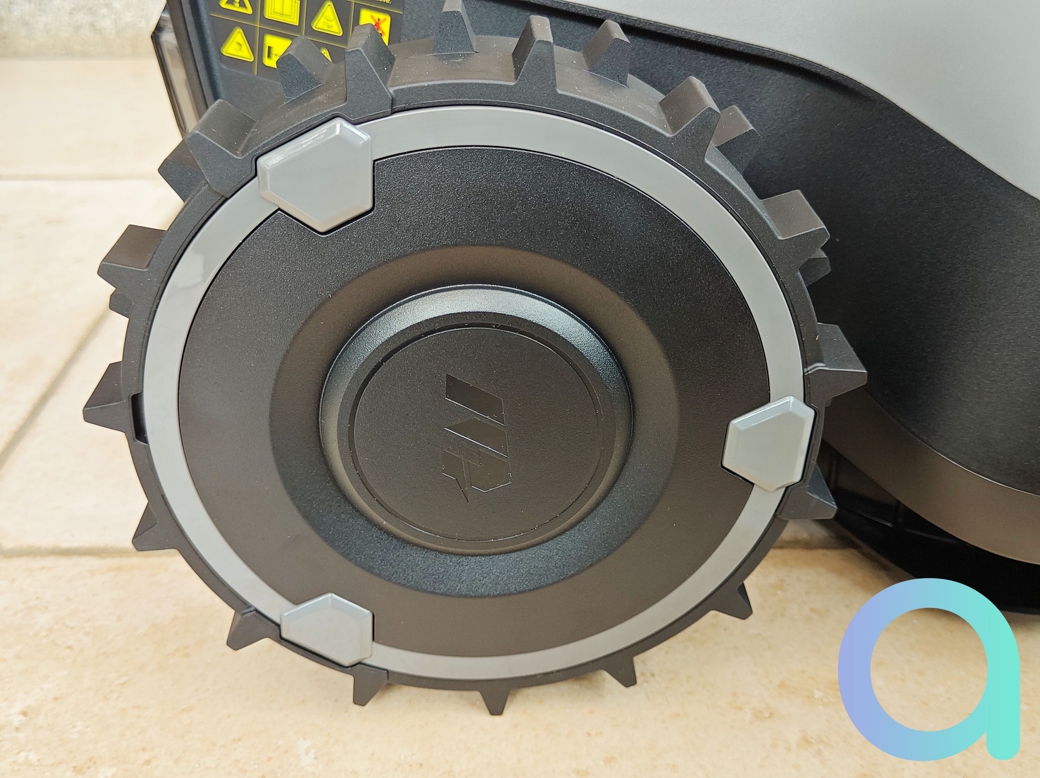 Le dessous nous permet une vue sur les roues. Les roues arrière sont les roues motrices. Celle à l’avant sont des roulettes 360° de 10 cm de diamètre et 5 cm de largeur (comme le Stiga A500). Il n’est donc pas fait pour passer sur des terrains trop accidentés, contrairement au Luba Mini AWD et ses 4 roues motrices. Pour le soulever, la poignée est sur l’avant, au niveau du peigne anti-scalping.