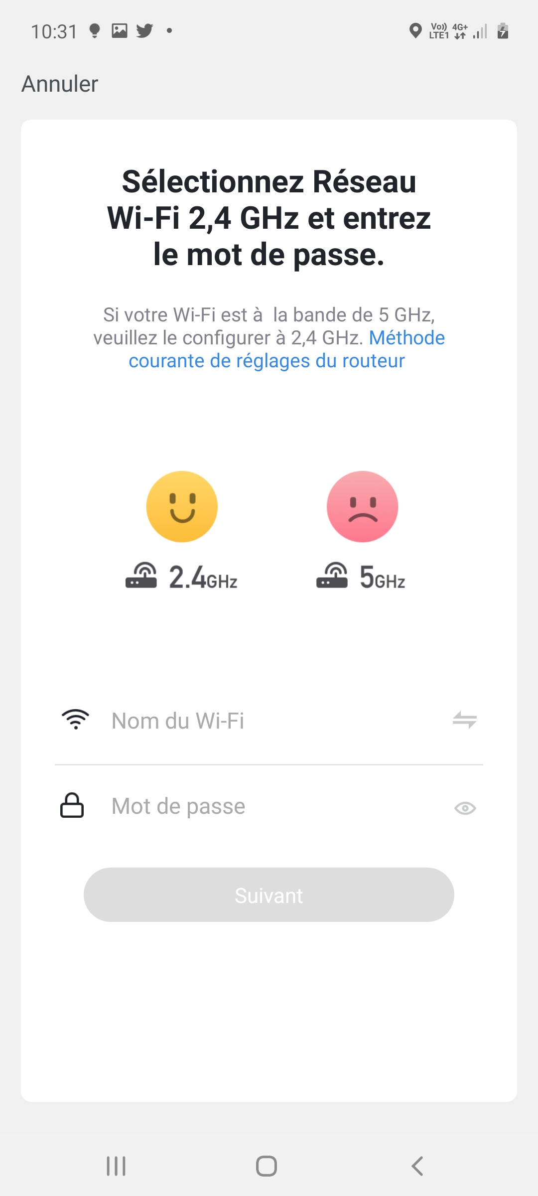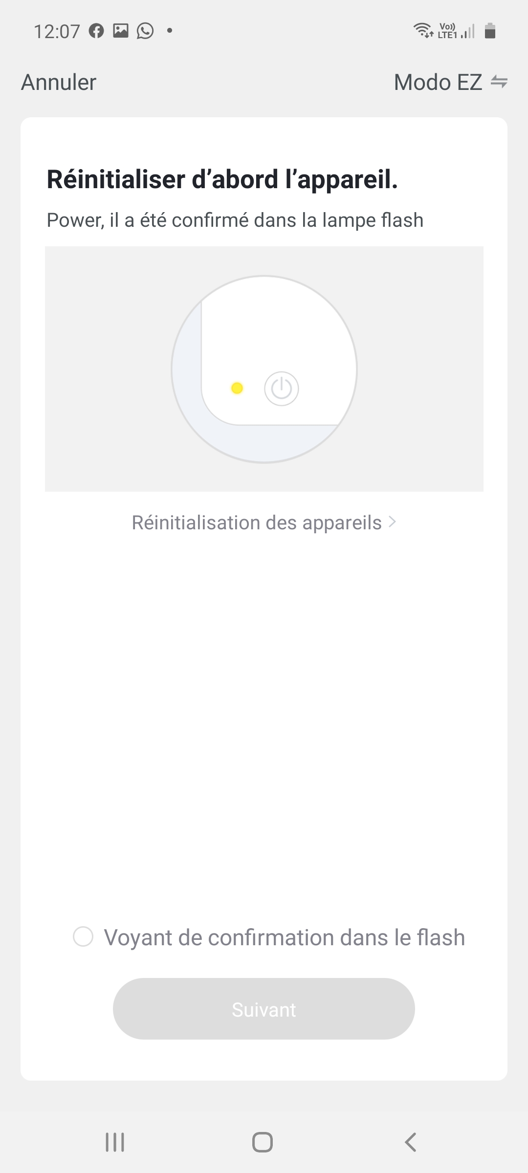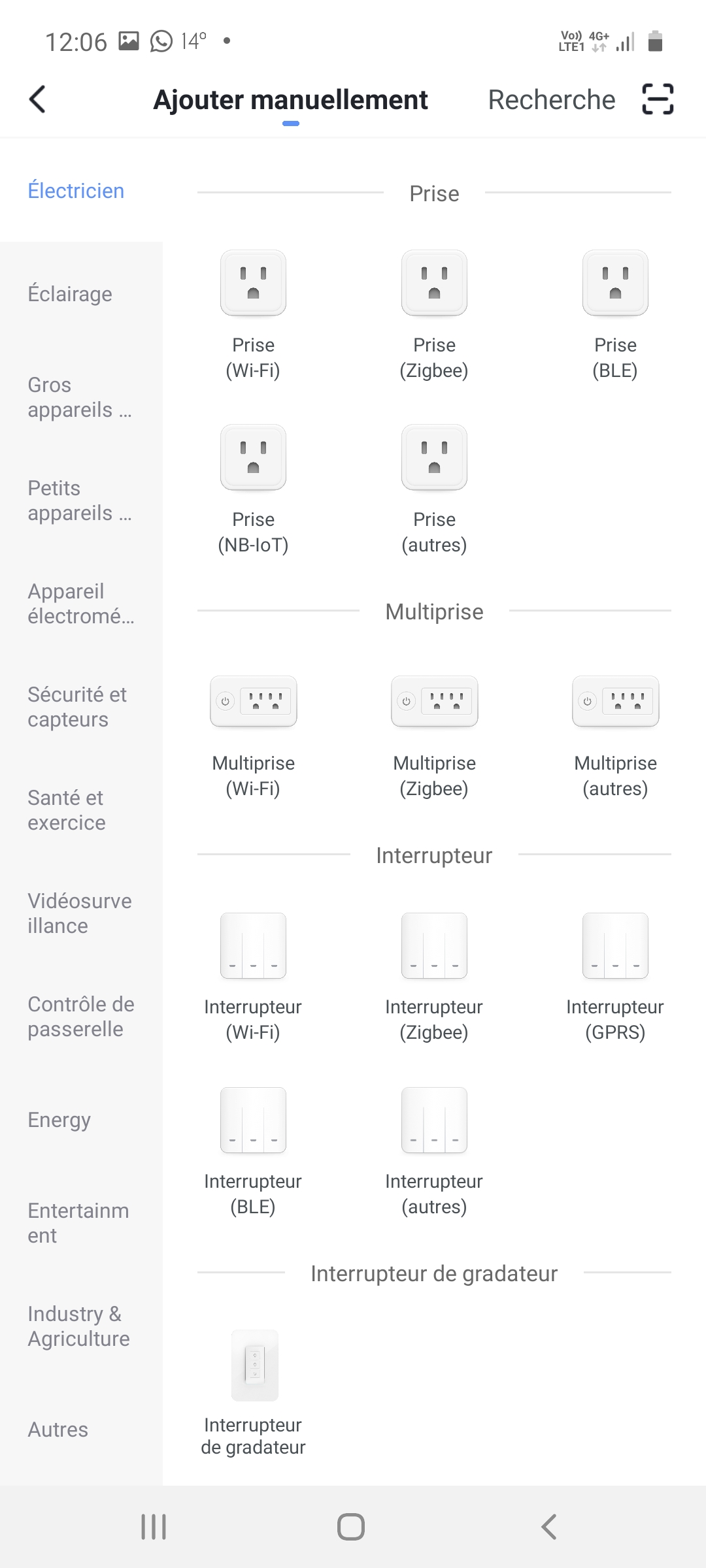 Depuis la page d’accueil de l’application Smart Life, un clic sur le « + » en haut à droite nous amène sur la liste des différentes catégories disponibles. Suivant la notice, qui même avec une loupe demande beaucoup d’effort pour décrypter ce qui est écrit ou voir les images, nous allons choisir depuis le premier menu à gauche « électricien » l’icône « interrupteur WI-FI » (oui-oui, faites nous confiance) dans la section centrale. Après avoir confirmé le nom et mot de passe du réseau Wi-Fi et coché que la LED verte clignote rapidement, la recherche de la veilleuse détecteur MoKo débute.