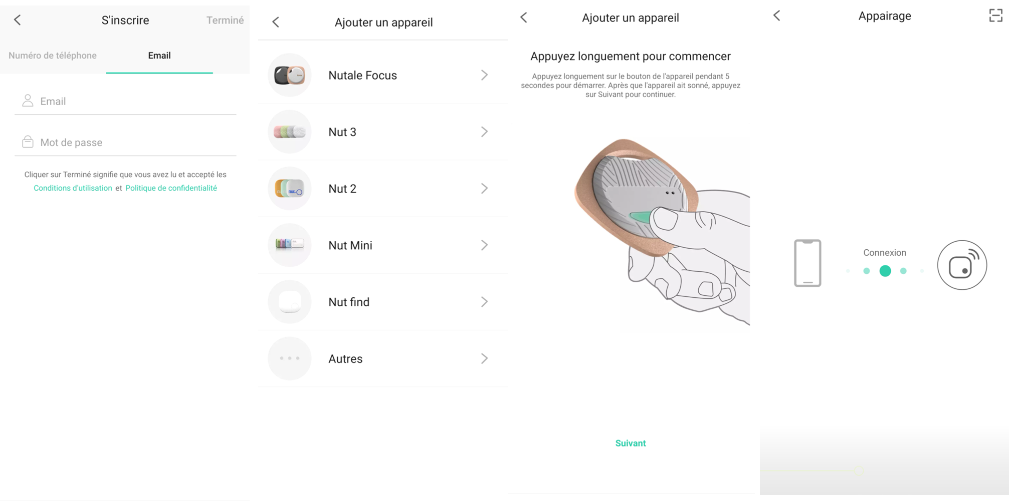 Avant de pouvoir s’en servir, il est nécessaire d’installer et de créer un compte sur l’application de la marque : Nut. Elle est disponible sous Android et iOS. Il vous faudra dans un premier temps créer un compte. Pour cela, vous pouvez utiliser votre courriel ou votre numéro de portable. Vous recevrez un code à noter dans la zone dédiée avant de définir votre mot de passe. Très important, donnez bien toutes les autorisations nécessaires à l’application pour que cela fonctionne sans problème. Si, par exemple, vous ne lui permettez pas de fonctionner en arrière-plan, elle se coupera et sera inutile. Idem si elle n’accède pas au GPS. Bien sûr, votre batterie va risque faire la tête.