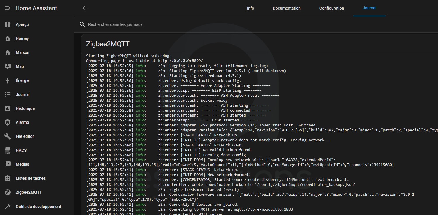 Un redémarrage du service suffit pour que le coordinateur soit reconnu et pleinement opérationnel. Zigbee2MQTT affiche alors les logs classiques et permet l’inclusion de périphériques sans accroc.