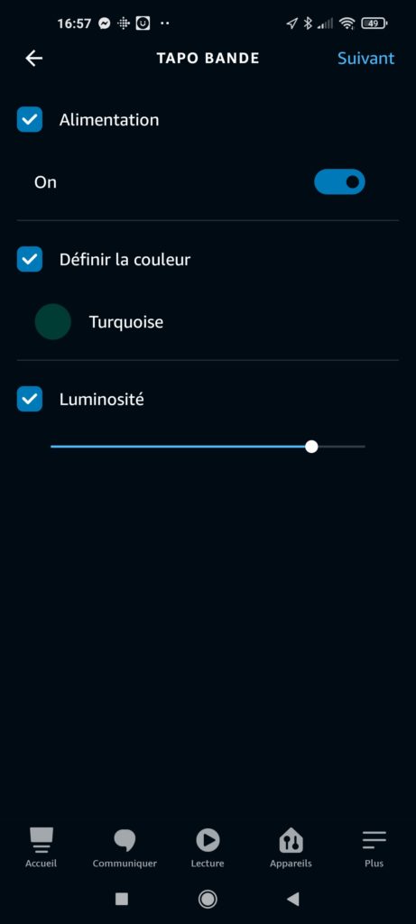 Les fonctionnalités depuis l’application restent en partie similaire à celles décrites déjà dans le test du ruban Tapo L900. Nous ne les reprenons pas en détail. Pour rappel, il est possible via l’application :