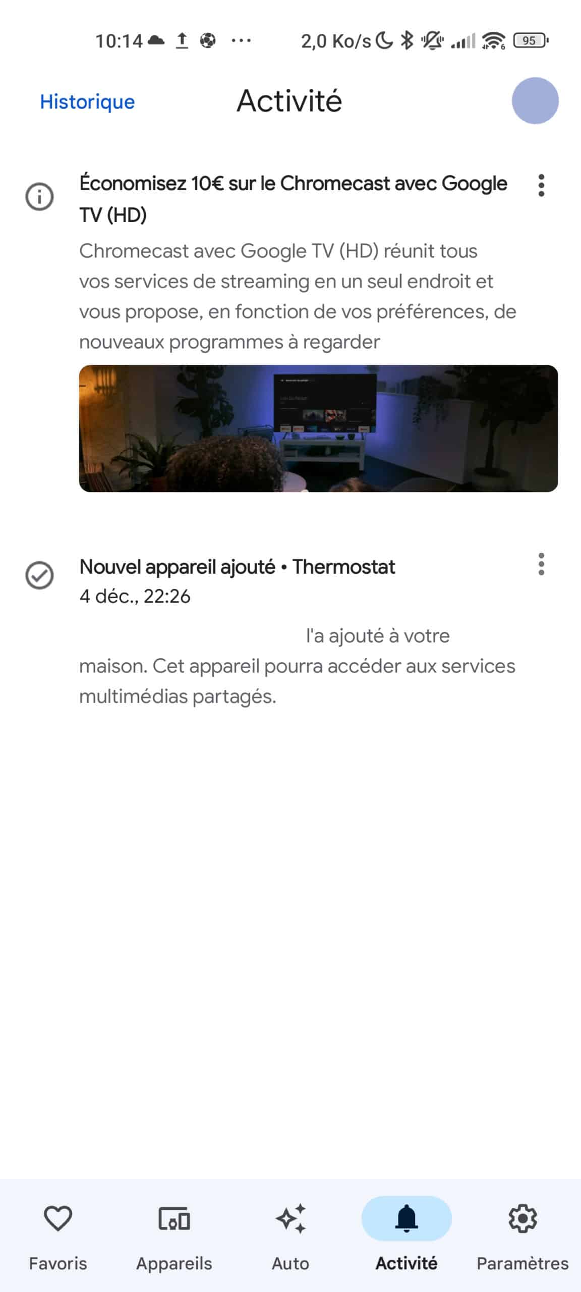 Même chose pour l’onglet Activité, une idée probablement héritée des logs de nos box domotiques qui s’avère très pratique pour gérer sa maison connectée. A condition d’y retrouver toute son activité et de pouvoir y injecter ce que l’on veut. Là encore, il y a de l’idée, mais Google pourrait faire mieux et, pourquoi pas, éviter de nous y insérer de la publicité…