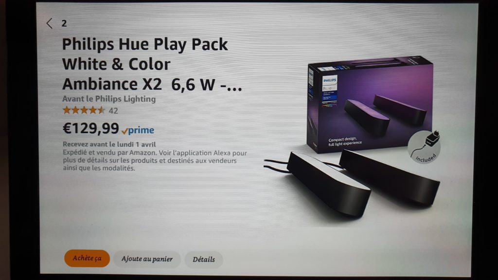 Avec Echo Show 2, en revanche, naviguer sur le catalogue d’Amazon est bien plus facile. Vous pouvez demander à Alexa d’exécuter une recherche, puis naviguer dans les résultats grâce à la surface tactile. L’interface est vraiment bien faite et on se prend rapidement au jeu. Un appui et vous pouvez glisser le produit dans votre panier ou utiliser le désormais célèbre achat en un clic inventé par Amazon.