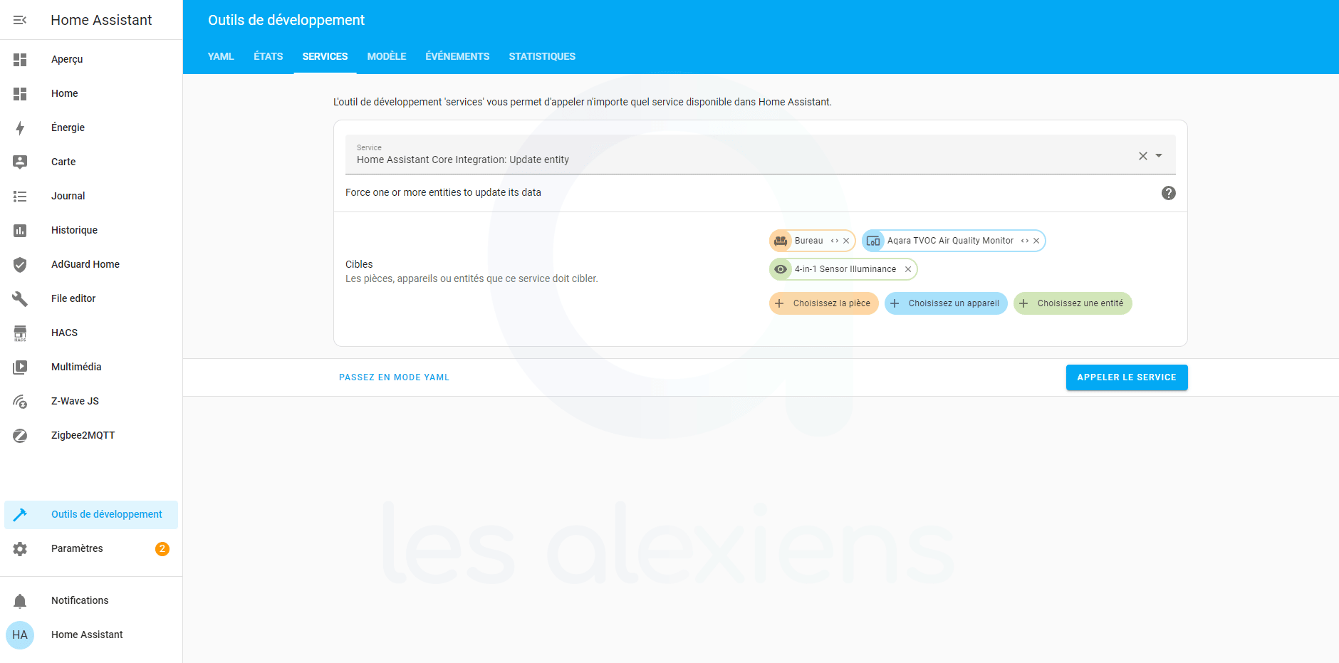 L’outil de développement « Services » vous permet de tester n’importe quel service avant de l’intégrer dans une automatisation afin de s’assurer de son bon fonctionnement