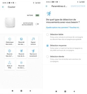 Le module de détection de mouvement va fonctionner de la même façon avec les mêmes paramétrages hormis un qui lui est spécifique. Il s’agit des « paramètres de détection ». Très pratique si vous avez des animaux de compagnie, vous déciderez de la sensibilité du détecteur pour éviter les déclenchements de vos alarmes dès que votre chien ou votre chat passe devant…