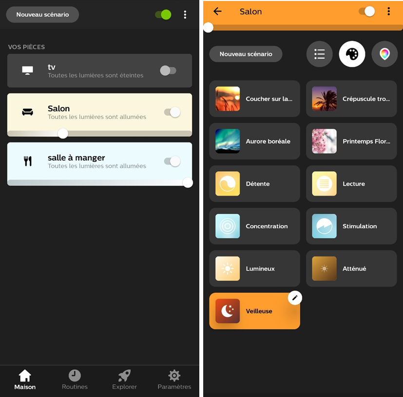 Une fois reconnue, vous pourrez utilisez les différentes possibilités offertes par l’application comme le Lab, les routines ou le pilotage global ou spécifique des ampoules d’une pièce. Pour chacune des ampoules, vous pouvez utiliser les scénarios préchargés par appareils, en créer par vous-même ou encore simplement sélectionner la couleur (au choix parmi 16 millions) et l’intensité.