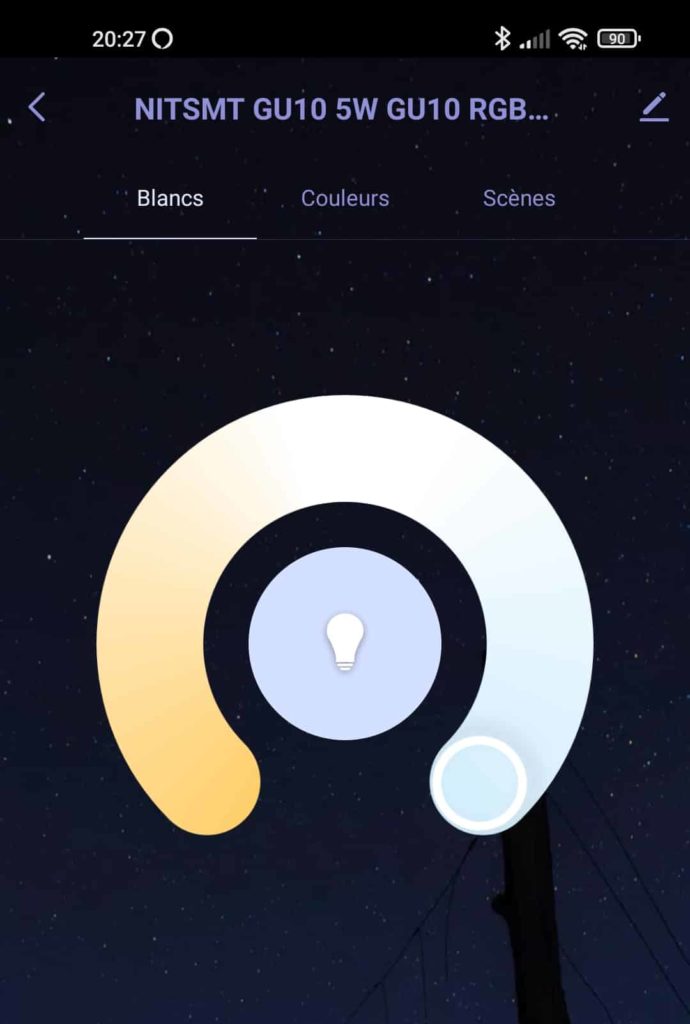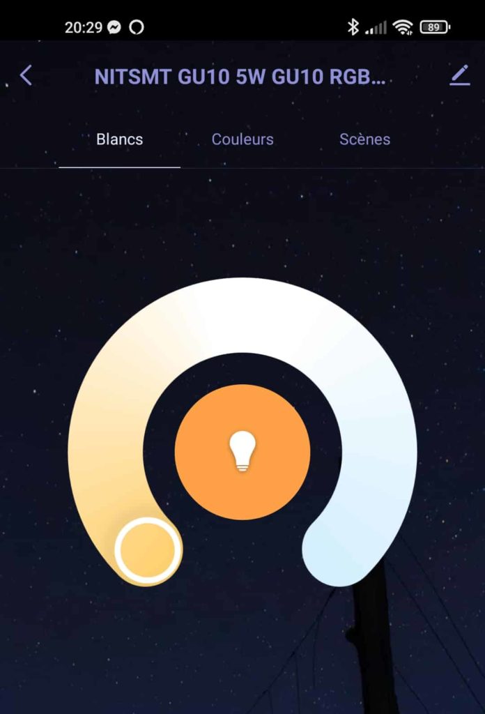 - Les Blancs : du chaud 2800K au froid 6000K. Déplacez votre doigt sur l’arc de cercle pour régler la température. Le panel n’est pas le plus large qui existe, c’est vrai, mais l’éclairage à l’unité par GU10 n’est pas forcément ce que l’on utilise le plus pour l’éclairage principal d’une pièce de vie et reste quand même suffisant pour trouver une température satisfaisante.
