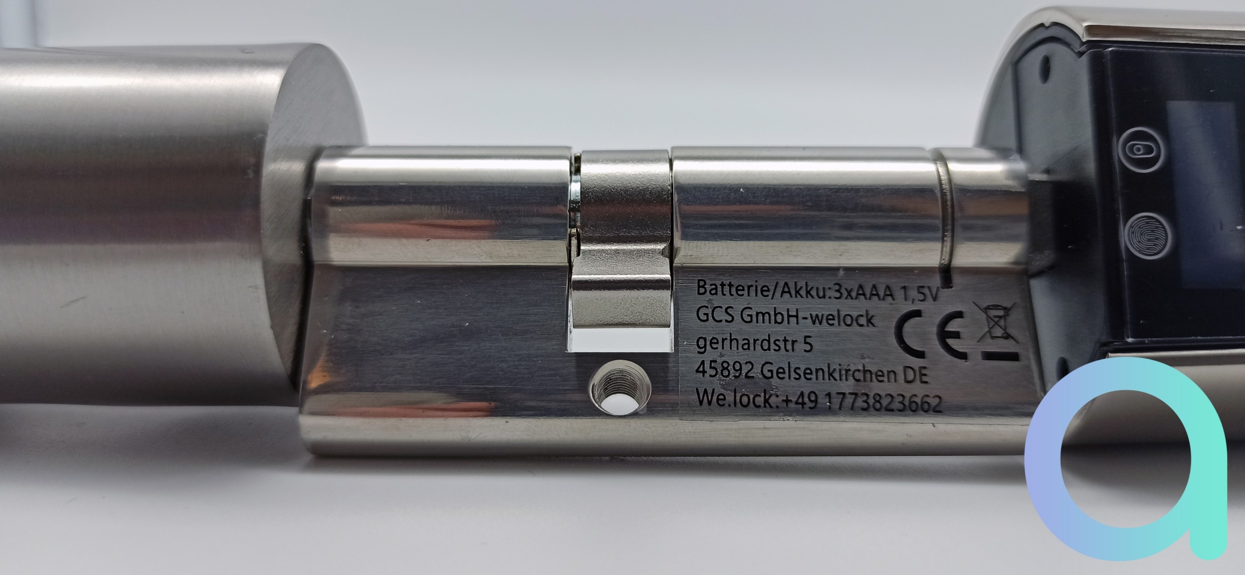 Le module de reconnaissance d’empreintes de la We.Lock AI.one est sur la face supérieure de la poignée extérieure. Le capteur d’empreinte a une résolution de 360 dpi (152 x 200 px). Il y a au-dessus un petit écran OLED de 17 x 5 mm. Très simple, mais grâce à son rétroéclairage vous pourrez accéder aux paramètres.