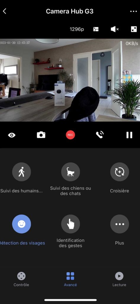 Afin d’activer manuellement une option, il faut réveiller la caméra en cliquant sur l’icône en forme d’œil, puis cliquer sur Avancé, et enfin sur l’option voulue.
