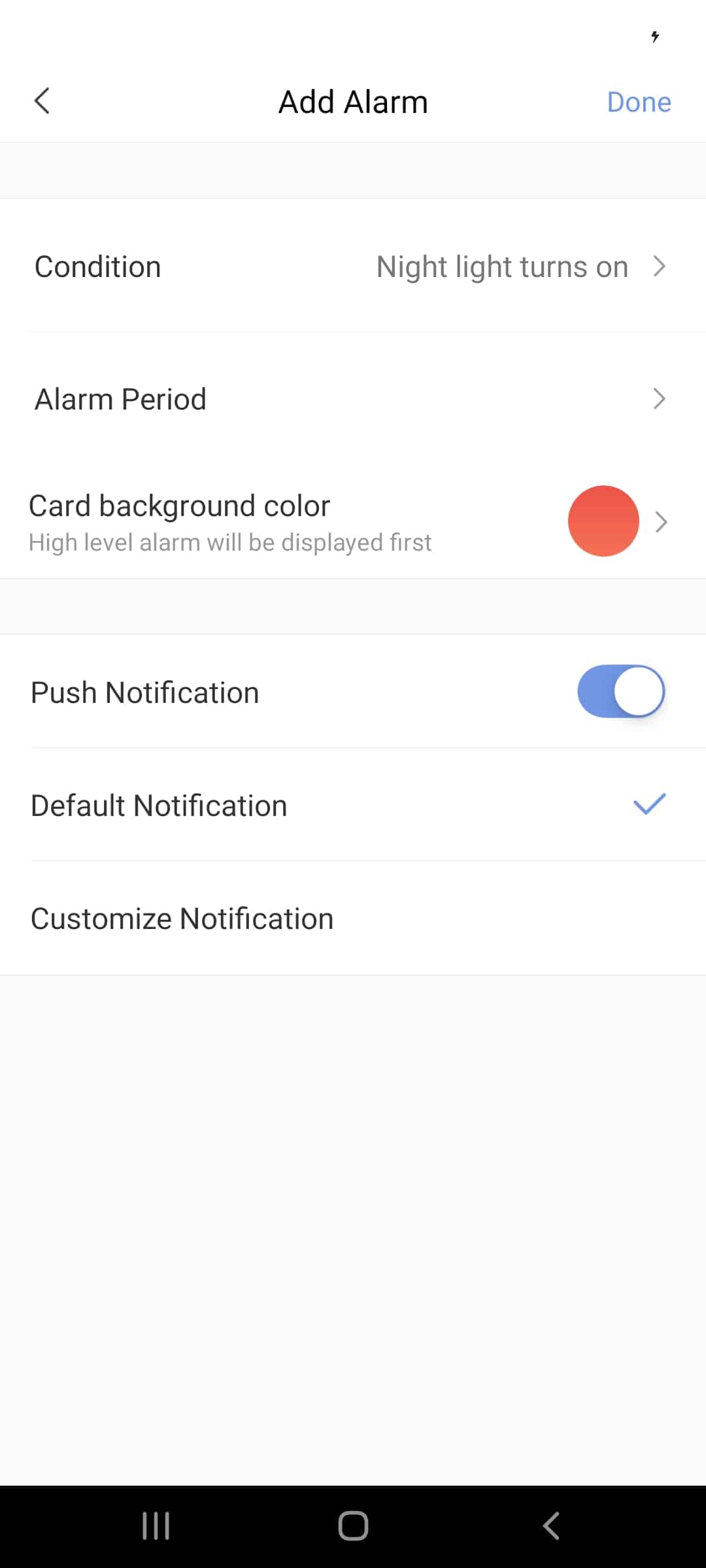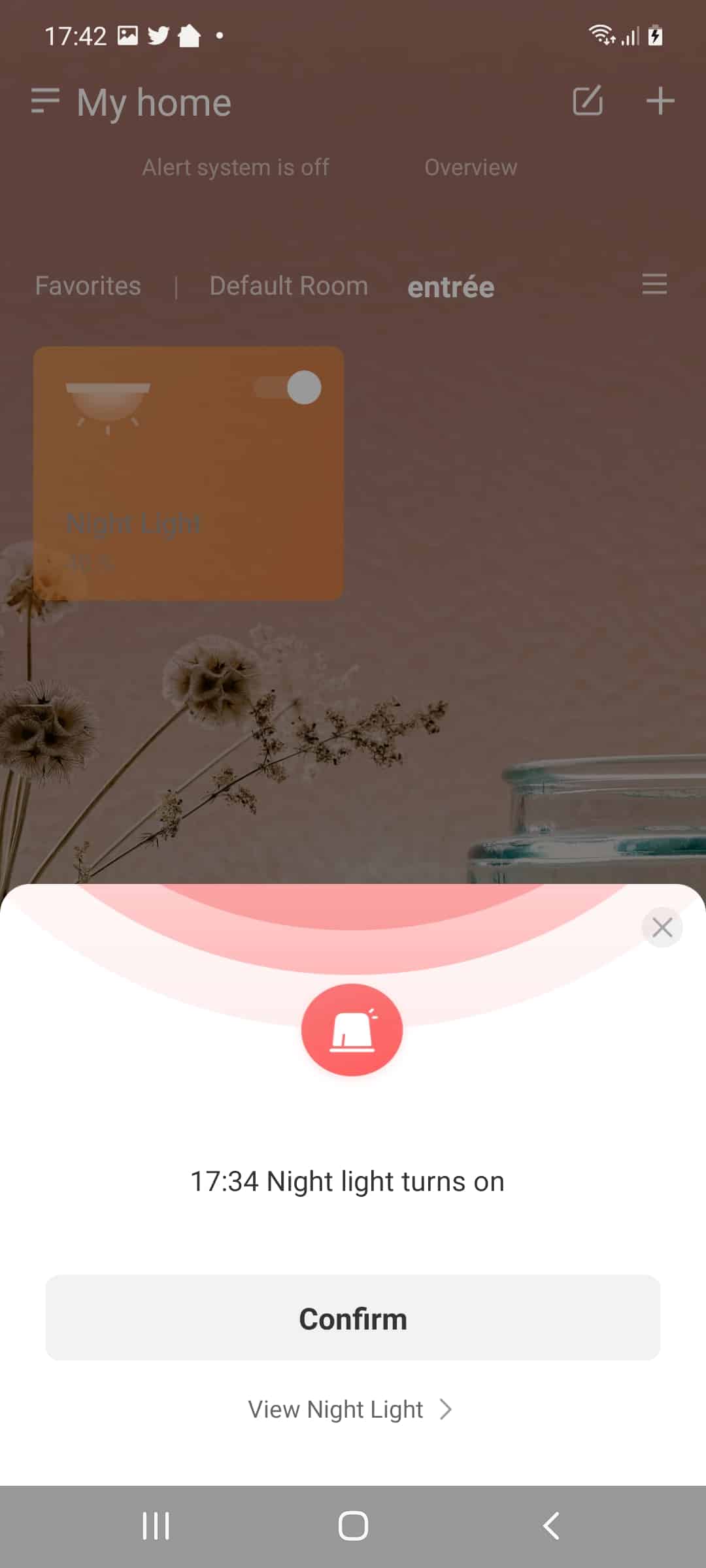 Une fois les paramètres rentrés, si votre veilleuse répond aux critères de votre alarme, vous verrez la vignette sur la page d’accueil prendre la couleur que vous avez configurez et il ne suffit pas de vouloir éteindre la veilleuse pour que le clignotement blanc/couleur définie dans l’alarme s’arrête car un message en bas d’écran apparait vous précisant que l’alarme est en cours. Pour stopper le message et le clignotement, cliquez sur « confirm » et la veilleuse restera dans la position définie si vous ne la modifiez pas.