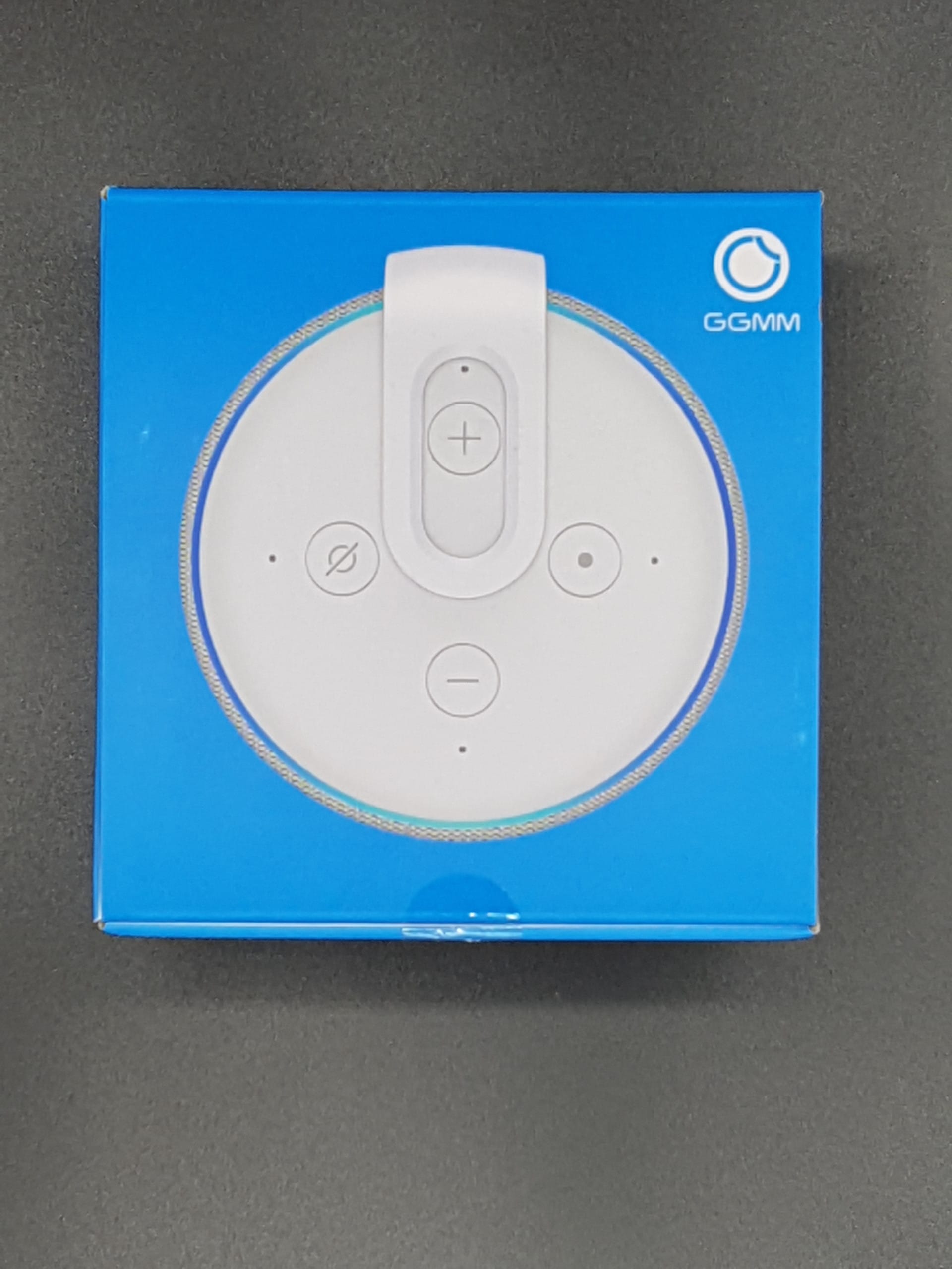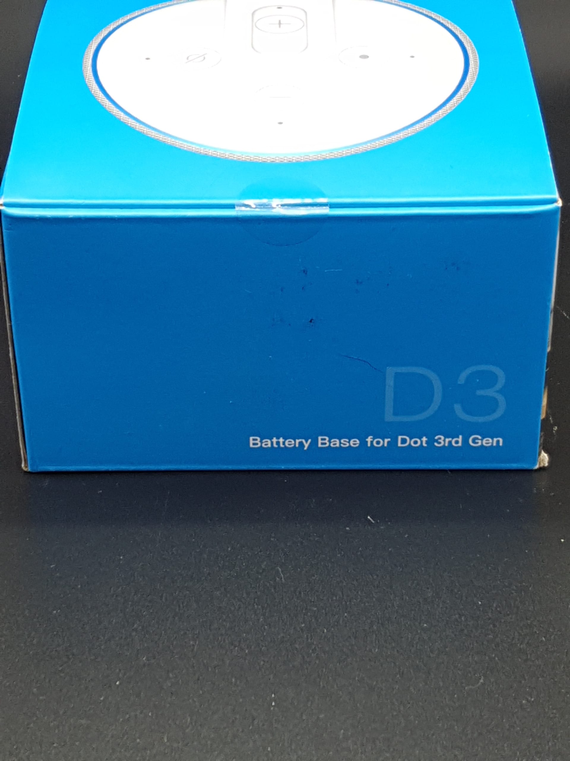 Nous recevons notre batterie dans un petit cartonnage de couleur bleu rappelant celui dédié aux appareils Amazon Echo. S’agissant d’une batterie pour une enceinte Echo Dot 3, le clin d’œil n’en est que plus sympathique. Le couvercle de la boîte affiche d’ailleurs un Dot 3 maintenu par la pince de la batterie GGMM D3. Le logo et la marque sont discrètement affichés dans le coin supérieur. Les cotés du carton affichent pour l’un, un dessin de la batterie, pour un autre une photo de mise en situation et les caractéristiques techniques sur un autre.