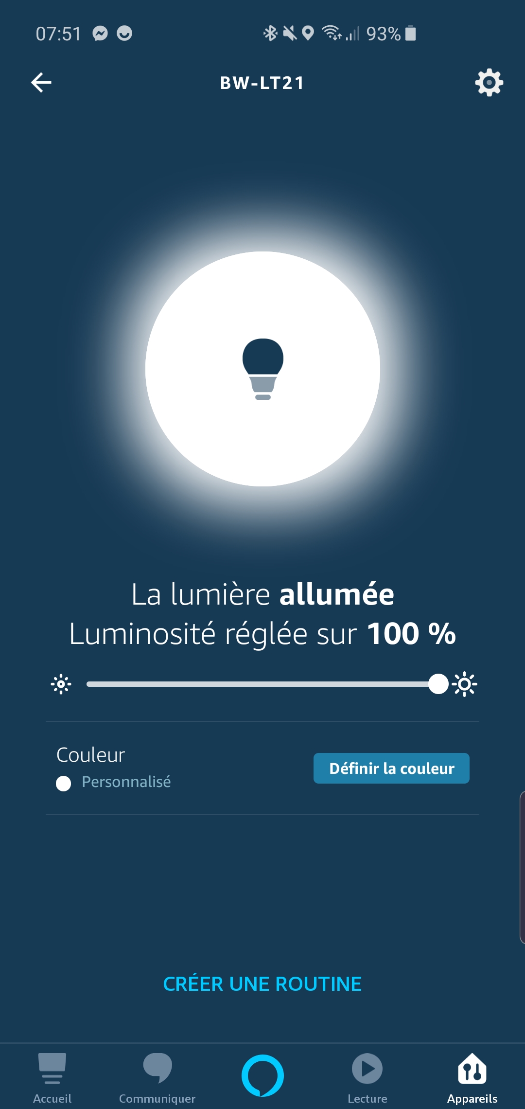 Vous retrouvez donc l’ampoule dans votre application Alexa, accompagnée des réglages de couleur et de luminosité. Alexa propose 16 couleurs, dont le blanc, et permet de régler la luminosité par palier de 1%. Vous pouvez, enfin, intégrer très simplement votre ampoule dans une routine.