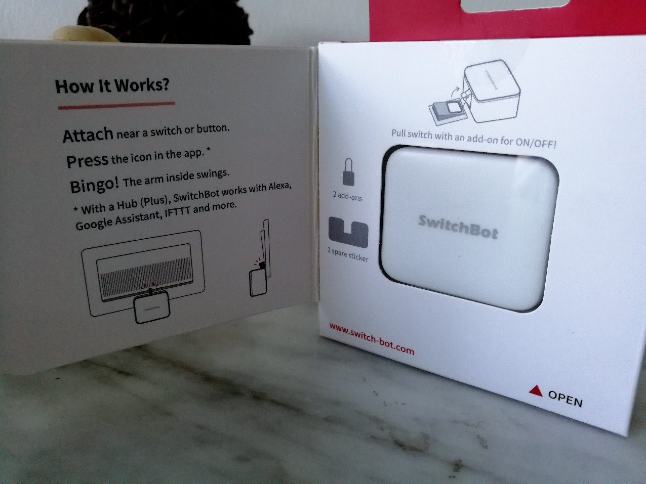 Dans la boite, nous trouvons notre boitier SwitchBot, une notice en anglais et japonais (assez succincte dans les deux langues), un double-face d’avance pour coller votre boitier (un est déjà en place) et deux addons (les petits liens utilisés pour la fonction on-off). Le bouton connecté est en plastique blanc ou noir, relativement qualitatif et solide.