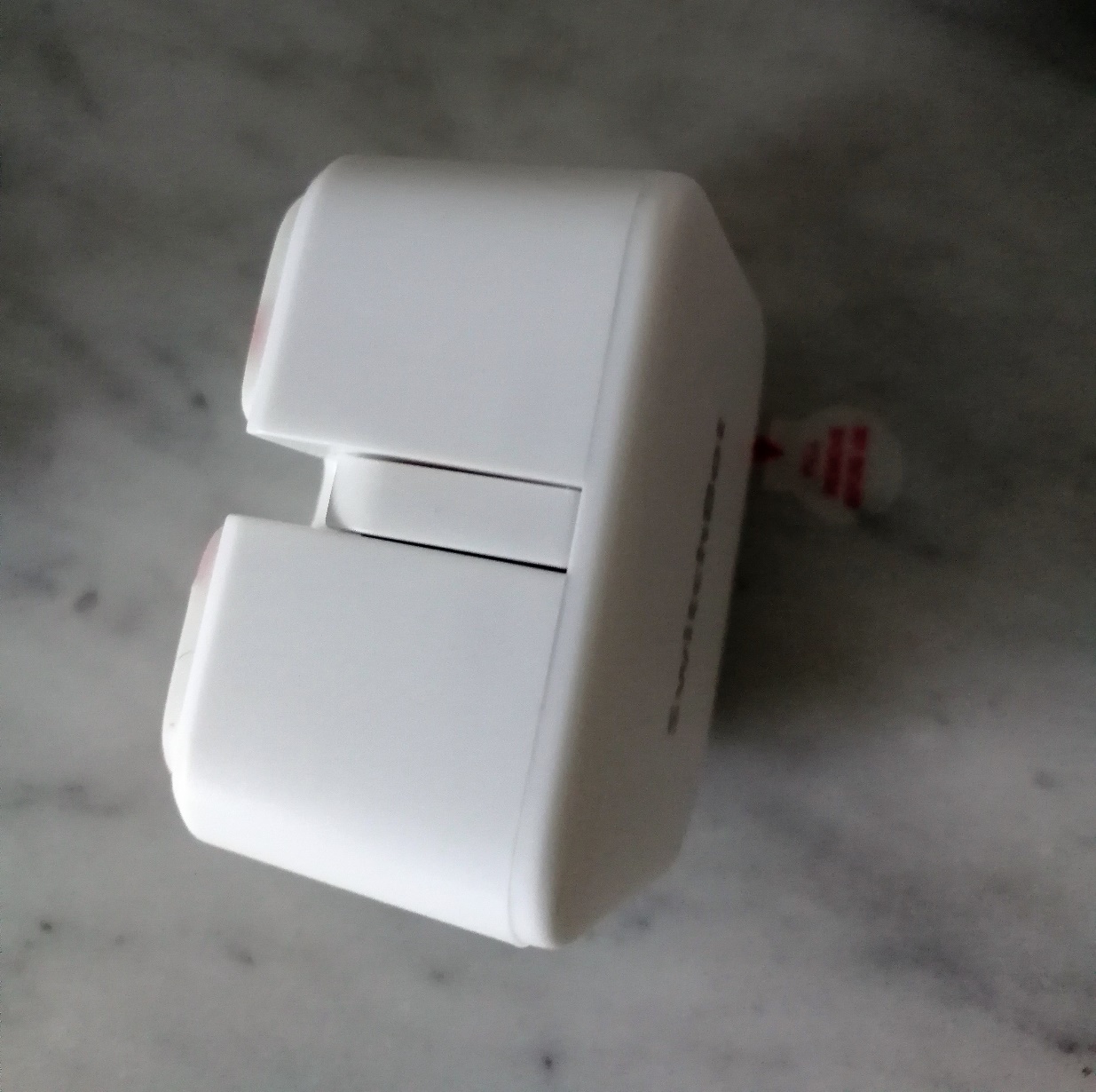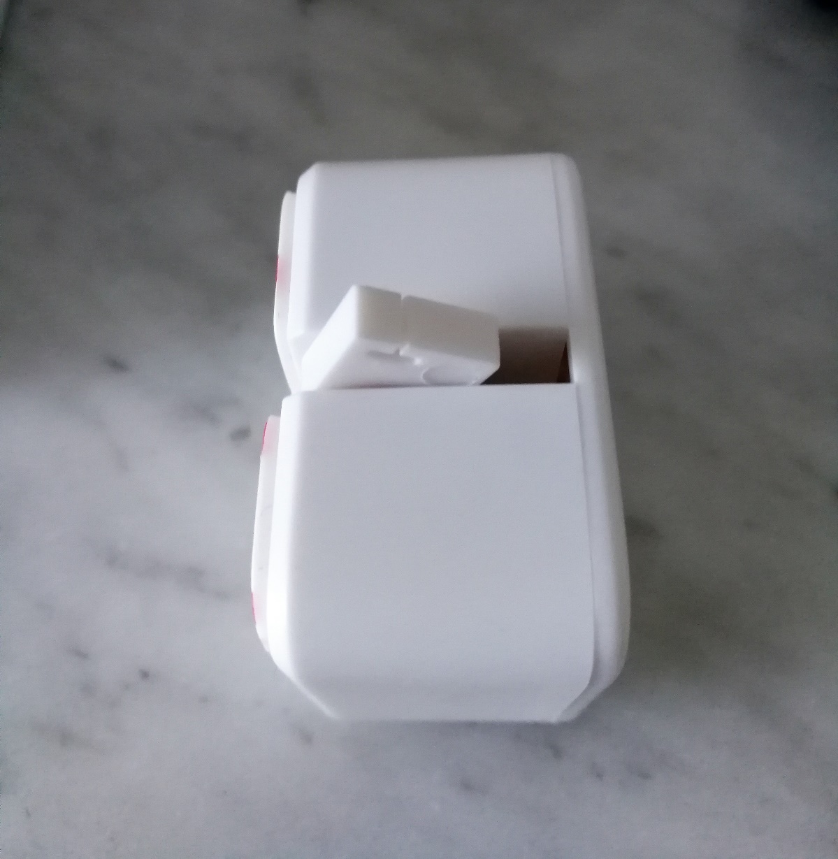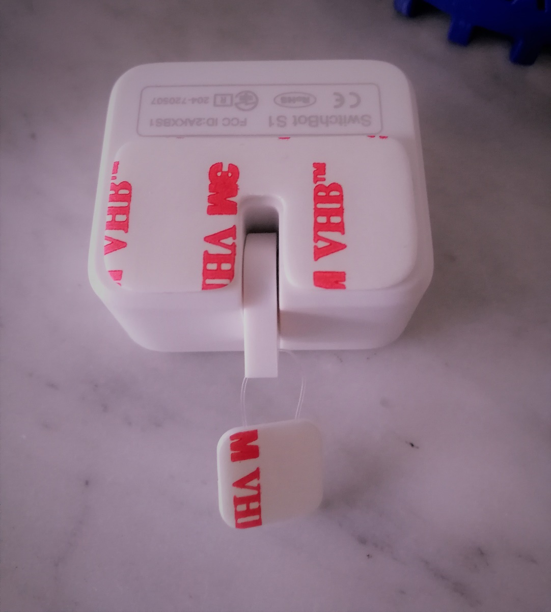 En effet, il est fait avant tout pour des interrupteurs de type UK ou asiatiques, avec un petit poussoir ou une petite bascule et donc beaucoup plus de place sur le cache pour venir l’y coller. Dans notre cas, il ne sera possible de coller que la moitié du boitier sur le cache… Mais malgré tout, c’est suffisant pour qu’il soit stable et ancré. Un boitier plus petit ou un bras plus long (pour coller le boitier à côté du cache et non à cheval dessus) serait un plus pour une version tout à fait adaptée à la France.