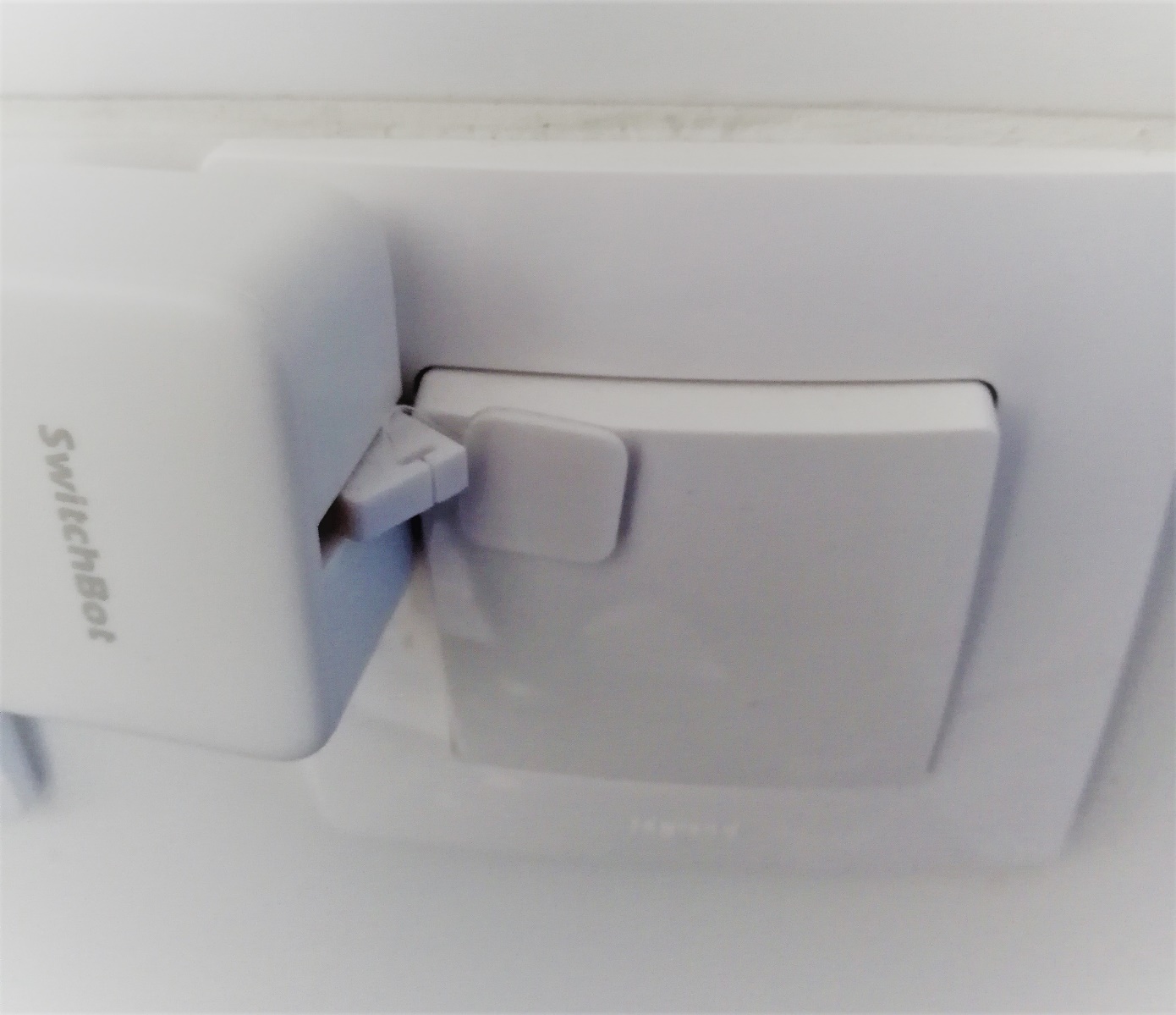 La mise en place est relativement simple. Il y a deux modes d’utilisation : en poussoir simple et en on/off. Dans les deux cas, la place à laquelle coller le boitier est identique. Il faut le mettre suffisamment proche du poussoir ou de la bascule pour que le bras vienne appuyer fermement dessus. Pour le mettre en on / off, il va falloir venir accrocher le « add-on » en le passant dans l’encoche en bout du bras et en collant l’autre extrémité sur le haut de la bascule. Et là… vous vous rendrez compte que la taille du boitier n’est pas tout à fait adaptée à nos interrupteurs français.