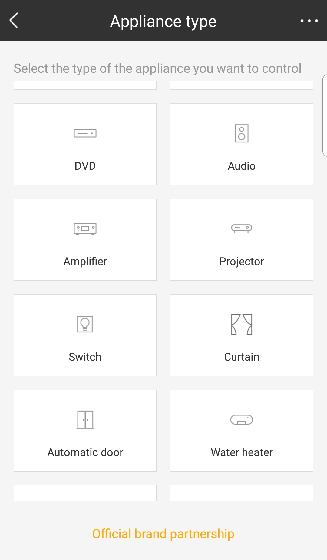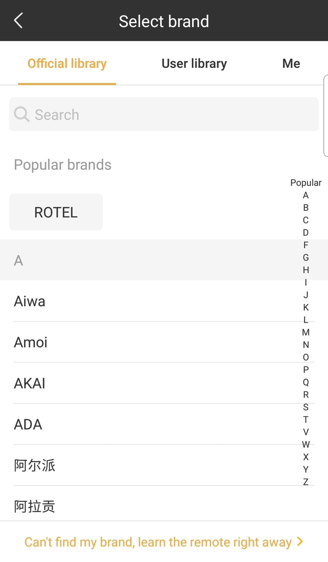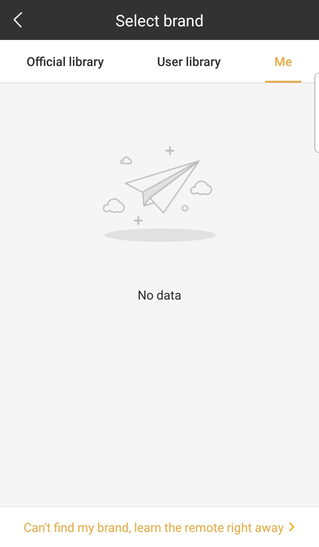 Choisissez le type d’appareil puis recherchez-le dans la liste officielle. Si toutefois vous ne le trouvez pas, rendez-vous sur « Me » et cliquez sur « Can’t find my brand, learn the remote right away ». Comme vous l’aurez compris, cela signifie que nous allons devoir apprendre la télécommande au Broadlink RM pro+.