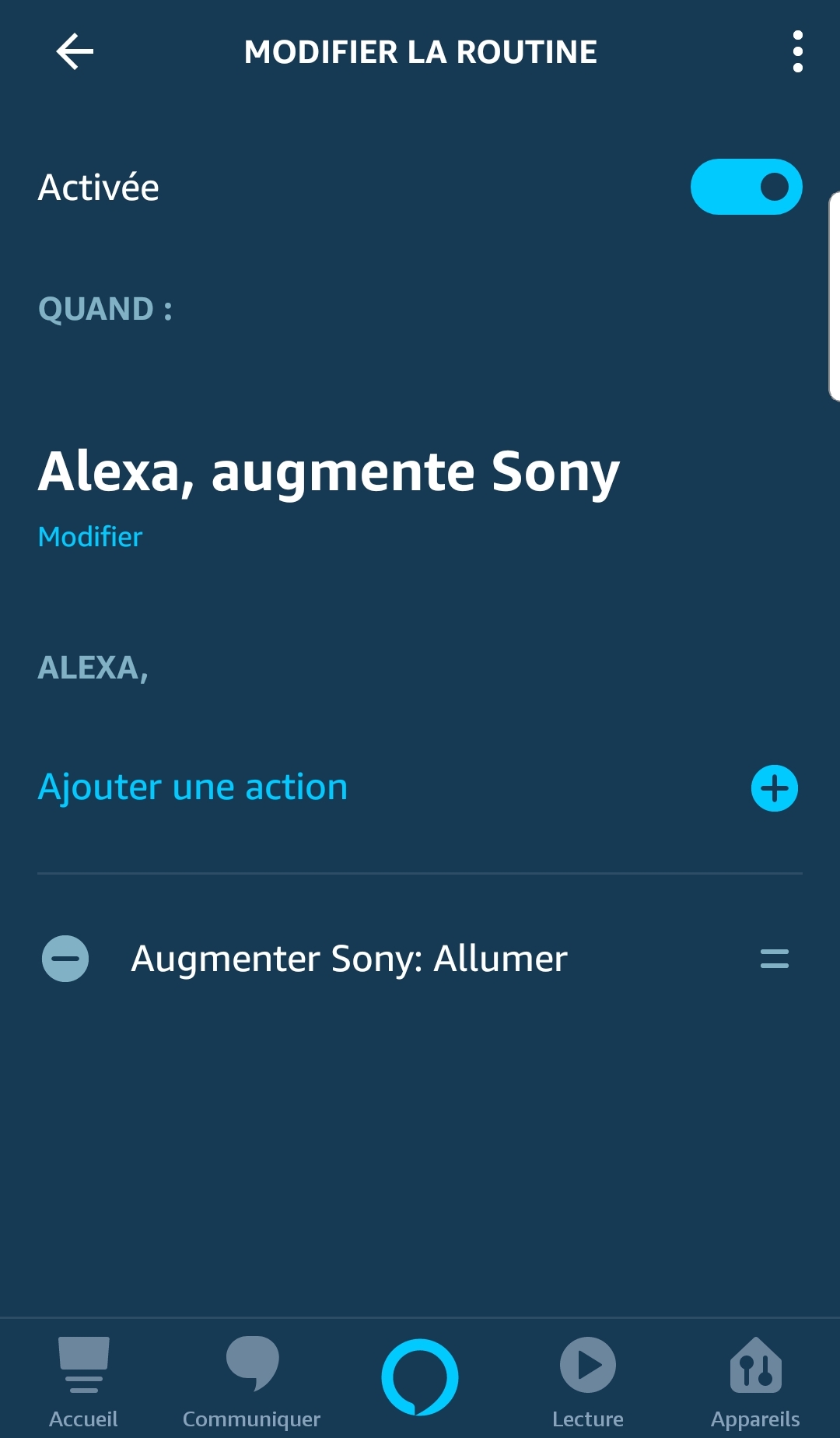 Le principal avantage des routines sera de vous permettre de personnaliser à loisir la commande vocale. Ici, nous avons fait simple et choisi d’appeler l’appareil « Sony ». Les commandes seront donc du type « Alexa, allume/éteins Sony » ou encore « Alexa, augmente/baisse Sony ». Là encore, à vous de voir ce qui vous convient le mieux, et libre à vous de créer des scénarios bien plus complets.