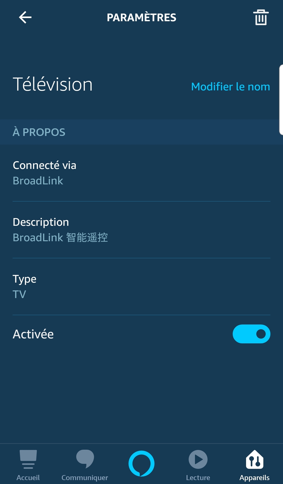 Il vous suffit de l’activer et d’y entrer les informations relatives à votre compte Broadlink que vous avez précédemment créé via l’application mobile. A ce stade, cependant, Alexa ne trouvera pas forcément votre Broadlink RM pro+ dans sa liste d’appareils. En effet, tous les types d’appareils n’apparaissent pas. Si vous configurez un tv, cependant, vous aurez le plaisir de la retrouver et de pouvoir la contrôler en l’appelant TV ou télévision Pour les autres appareils, ne vous inquiétez pas, vous pourrez bel et bien les utiliser également! Il vous faudra juste, au préalable, créer des scènes dans l’application IHC for EU. Ceci fait, Alexa devrait automatiquement détecter ces scènes et vous pourrez dès lors les contrôler à la voix.