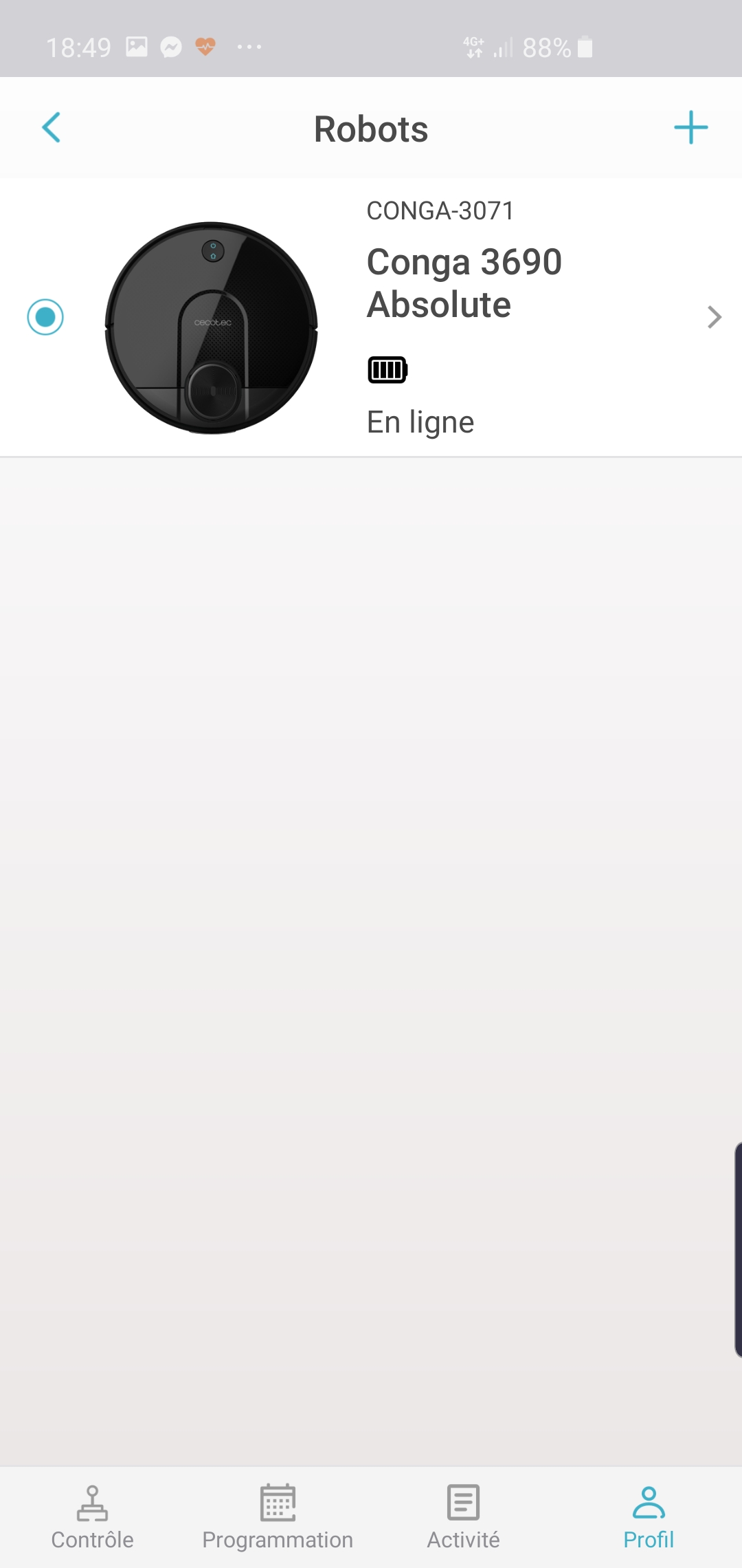 L’application est divisée en quatre grands menus : « Contrôle » qui vous permet de contrôler votre Conga 3690 Absolute et de lancer des séquences de nettoyage, « Programmation » qui comme son nom l’indique sert à programmer des nettoyages automatiques, « Activité » qui vous renseigne sur les diverses séquences effectuées par votre robot, « Profil » qui classiquement offre divers paramètres concernant votre compte et les traditionnelles mentions légales.