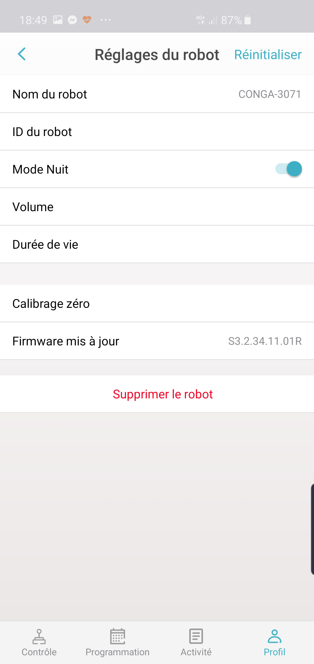 Dans l’onglet « Profil », vous allez classiquement retrouver les informations concernant votre compte (adresse mail et mot de passe), mais surtout les réglages plus poussés de votre robot (ou de plusieurs d’ailleurs) tels que le nom du robot, son ID, le mode nuit (souvent appelé « ne pas déranger« , ce mode correspond au créneau horaire pendant lequel le robot ne se déclenchera pas seul), volume de bips du robot (notez que le Conga ne parle pas), la durée de vie des divers consommables du robot (brosse latérale, serpillère, filtres HEPA, brosse principale) mais aussi des sensors que vous n’aurez pas à changer mais à nettoyer de temps à autre.