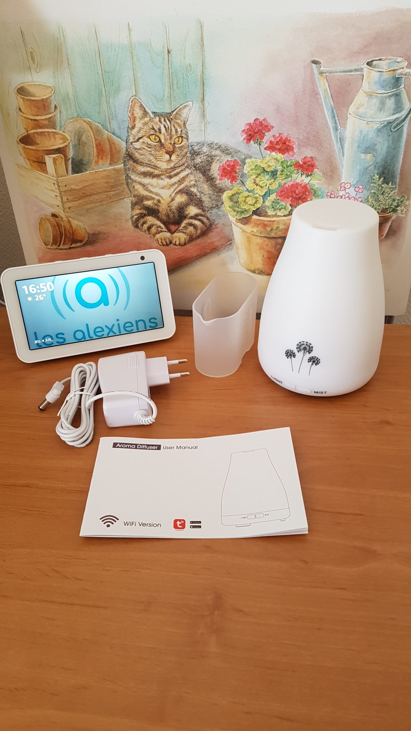 Le design de notre emballage est certes inexistant, mais le carton est suffisamment épais pour le protéger de tous les aléas du transport qu’il a pu subir pour nous parvenir..A l’intérieur on trouve notre diffuseur d’huiles essentielles composé d’un socle et d’un cône en plastique rigide mat dont la dimension est de 10.6 cm pour sa base et 14.7 cm pour sa hauteur pour un poids affiché de 260 grammes, un doseur pour mesurer les 150 ml d’eau maximales que peut contenir l’appareil. Nous trouvons également bien sur, la prise électrique (deux broches) et le mode opératoire (en anglais exclusivement). Notre appareil fonctionne en Wi-Fi sur le 2.4 GHz et sous l’application Tuya (ou SmartLife) comme le logo sur le mode opératoire l’indique. Cela ne devrait pas poser de difficulté quant à l’installation.
