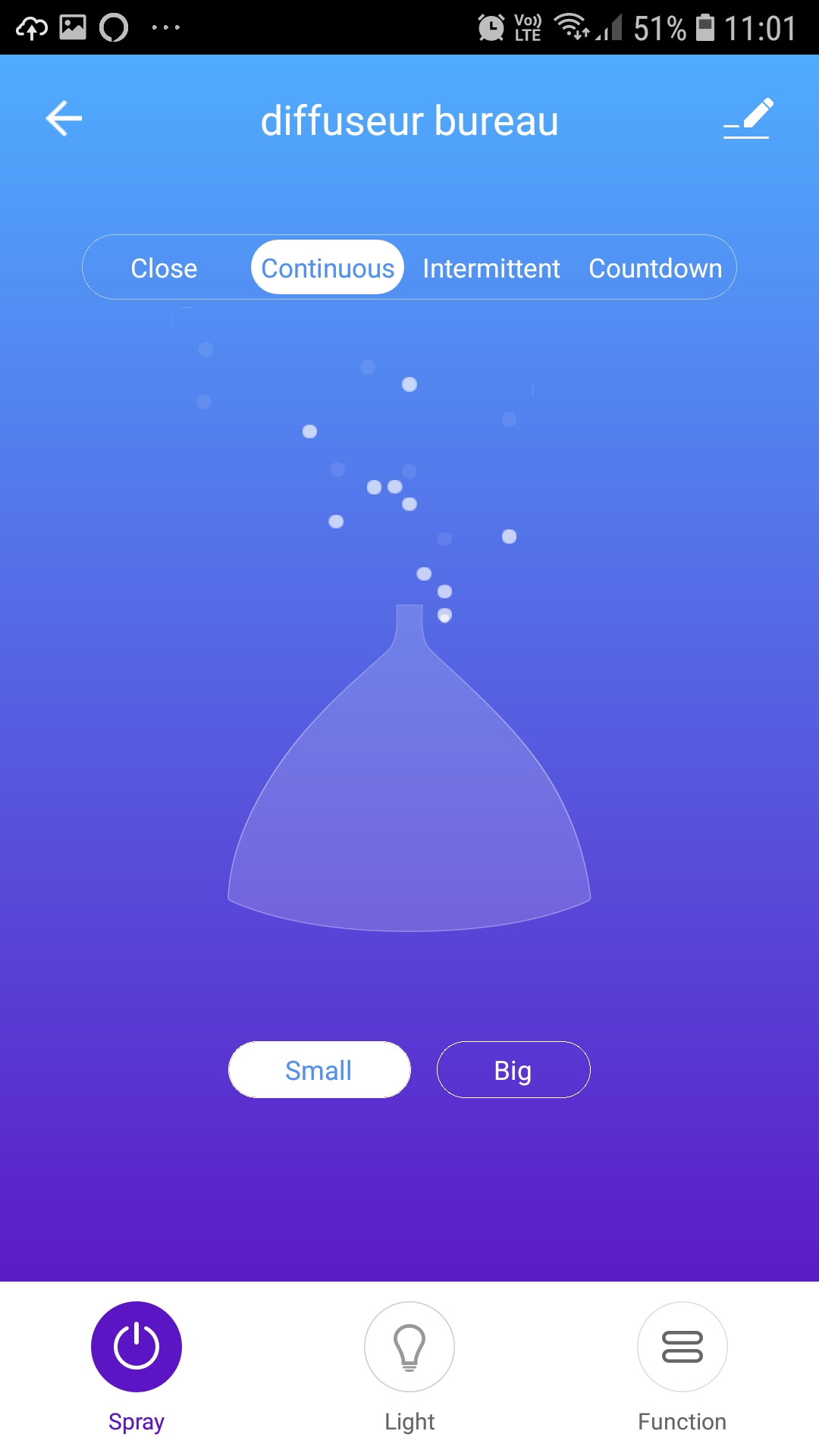 Dans l’application, notre diffuseur apparaît avec 3 boutons fonction en bas : spray, light et function.