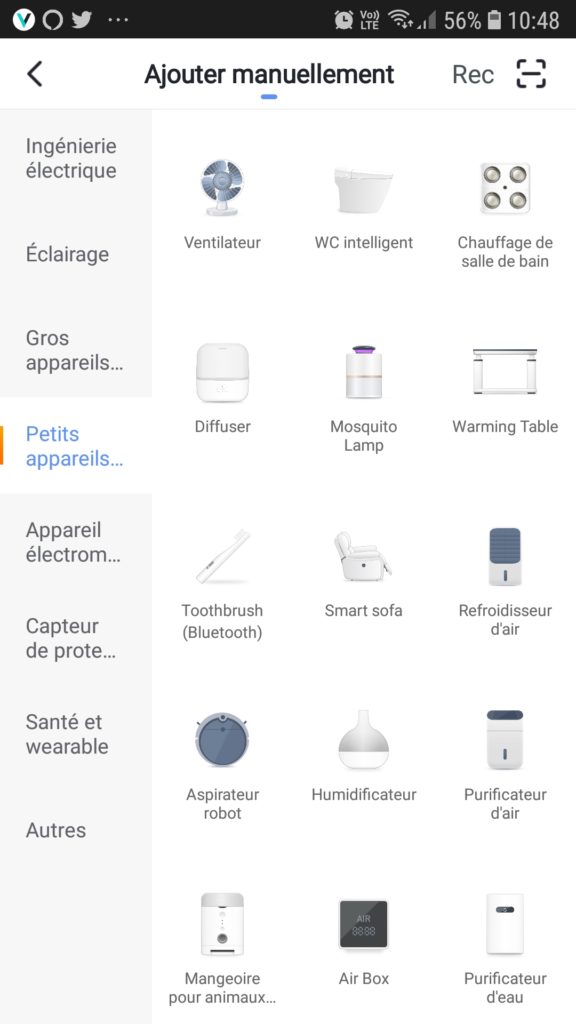 Dans Smart Life, après avoir cliqué sur le + en haut à droite, nous allons choisir Petits appareils et nous trouvons la catégorie diffuseur (et ça tombe bien, n’est-ce pas? ). Normalement, une invitation à procéder à l’appariement de votre appareil à votre réseau wifi se fait via le clignotement des deux LED sur le diffuseur.