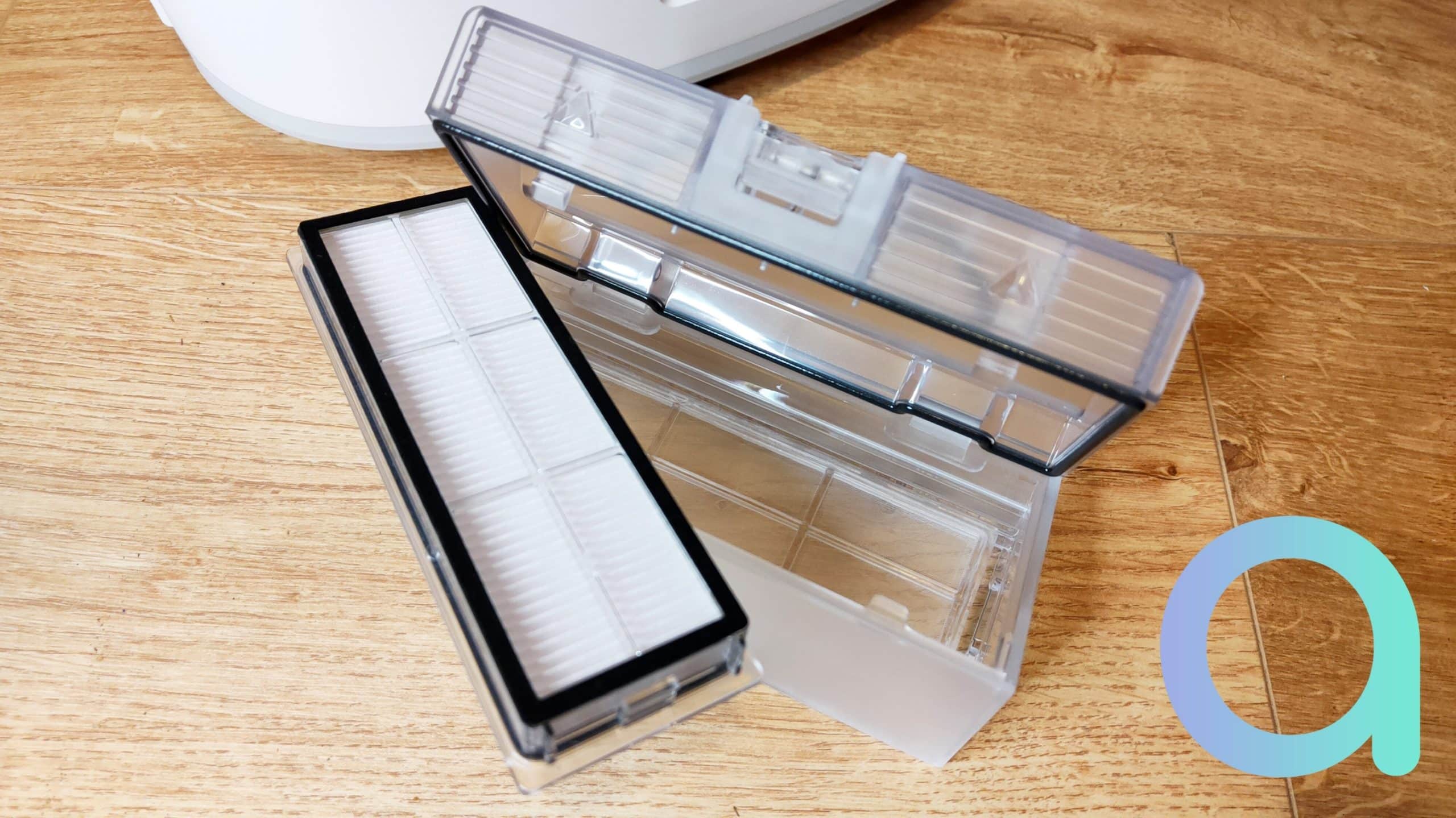 Qu’a-t-il sous le capot ? Vous trouverez un bac à poussière de 450 ml. Le volume est assez généreux et c’est tant mieux car la vidange du bac se fera à la main et non en automatique. Il vous faudra donc l’enlever régulièrement et l’ouvrir pour le vider. Cela se fait simplement et rapidement. Comptez une capacité de 3 passages environs. Ce bac est équipé d’un filtre HEPA arrêtant 99% des PM2.5 (voir notre test de purificateur d’air pour plus d’information sur les particules en suspension ou Particulate Matter). Il y a également un préfiltre en nylon pour ne pas le saturer trop vite. Le filtre est à changer toutes les 150 heures… et il n’y en a pas d’avance.